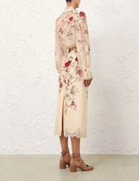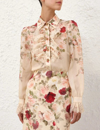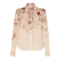 600074234OWT000 / 5355TF251/00/CCSC - Silk chiffon construction - Floral print throughout - Lace panel front placket - Classic collar - Long sleeves with gathered cuffs - Button-up closure - Semi-sheer finish - Regular fit The ZIMMERMANN Hypnotic Tux Shirt delivers romantic femininity with sophisticated tailoring and delicate floral artistry. Crafted from lightweight silk chiffon in soft cream base with cascading pink and red rose prints, featuring intricate lace panels down the front placket. The gathered cuffs and sheer construction create an ethereal silhouette that embodies the brand's signature bohemian luxury aesthetic.