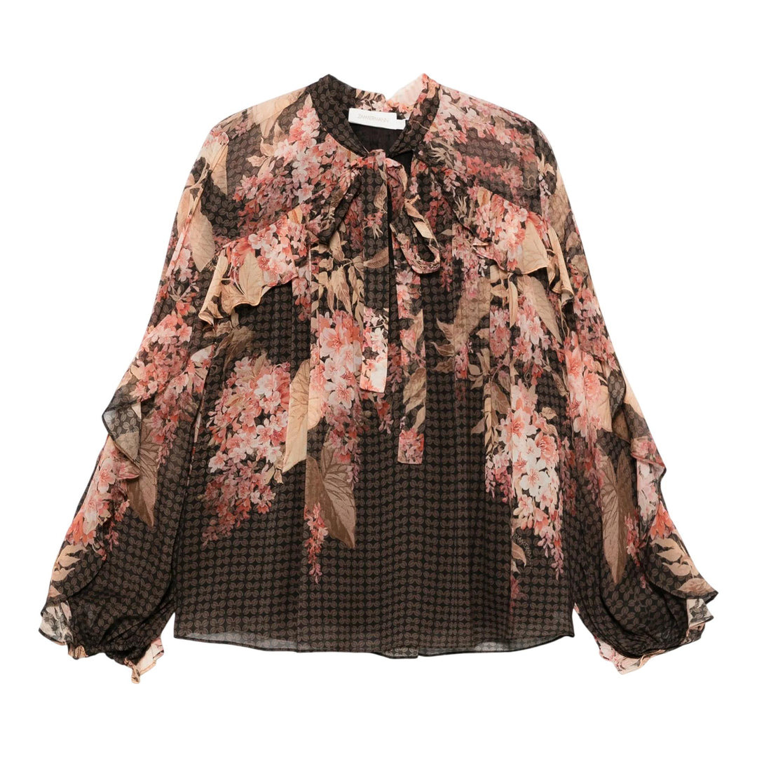 600066926BLK000 / 4101TS251/00/BLF - Tie-neck closure with self-tie ribbon - Long sleeves with ruffle trim - Floral and geometric mixed print - Lightweight silk georgette construction - Semi-sheer fabrication - Relaxed fit through body The Zimmermann Illuminate Flutter Blouse delivers romantic femininity with bohemian elegance and sophisticated draping. Crafted from lightweight silk georgette featuring painterly floral motifs in dusty rose and sage tones against a geometric backdrop. The billowing sleeves and delicate tie-neck detail showcase Zimmermann's signature romantic aesthetic with contemporary edge.