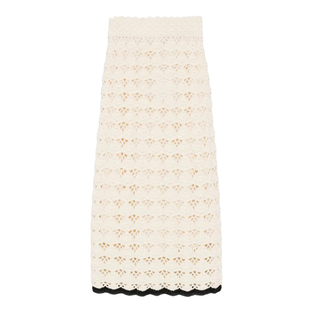 600070162OWT001 / 3174SSS251/00/CRBL - Premium cotton crochet construction - Geometric eyelet lace pattern - Contrast black hem trim - Fitted waistband - Midi length - Fully lined - Side zip closure ZIMMERMANN Rhiannon Crochet Skirt delivers romantic femininity with intricate handcrafted lace detailing and sophisticated silhouette. Made from premium cotton crochet in ivory with geometric eyelet patterns throughout, featuring contrast black trim along the hem. The midi length and fitted waistband create an elegant profile that embodies ZIMMERMANN's signature bohemian luxury aesthetic.