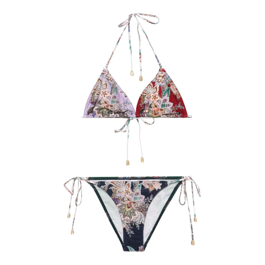 600070155MLT000 / 1839WSS251/00/SPLI - Adjustable triangle bikini top with halter neck ties - Gold-tone metal ring hardware - Contrast floral print panels in purple, red and navy - Tie-side bikini bottoms with adjustable coverage - Stretch lycra construction - Fully lined - Brazilian-cut bottom ZIMMERMANN Rhiannon Mini Tri Bikini delivers luxury swimwear with bohemian-inspired artistry and contemporary feminine appeal. Crafted from premium stretch lycra with contrasting floral panels in purple, red, and navy colorways, featuring adjustable triangle cups and tie-side bottoms. The signature ZIMMERMANN botanical print and gold-tone hardware details create an elevated beach-to-resort aesthetic.
