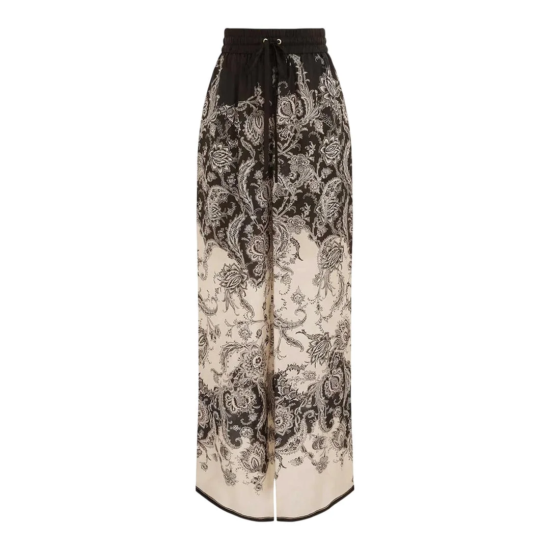 300047811BLK-00 / P53254PSS251/00/CRMBLKFLO - Drawstring elasticated waistband - Wide leg relaxed fit - Paisley print in ombre gradient - Silk-blend fabric construction - Full-length inseam - Flowing palazzo silhouette The ZIMMERMANN Rhiannon Relaxed Pant delivers bohemian luxury with flowing silhouette and sophisticated ease. Crafted from lightweight silk-blend fabric featuring intricate paisley print in black and cream ombre gradient, offering ethereal movement and comfort. The drawstring waist and wide-leg cut create an effortlessly elegant statement piece perfect for resort and city styling.