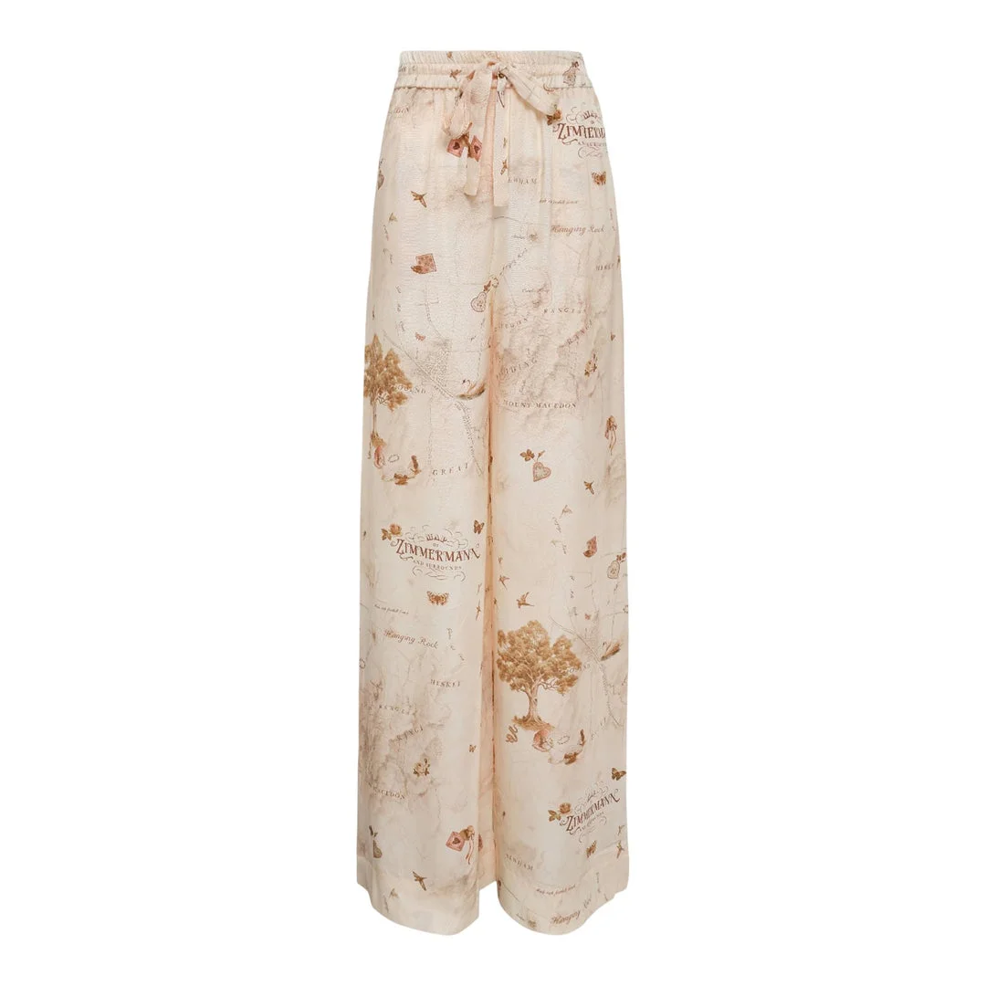 600074208PRT020 / 1111PF25R/00/MPR - Elasticated waistband with drawstring ties - Wide-leg silhouette - Vintage map print throughout - Flowing silk-blend construction - Side seam pockets - Relaxed fit ZIMMERMANN Track Pant delivers luxurious comfort with bohemian resort elegance. Crafted from flowing silk-blend fabric in cream with vintage map print detailing, featuring the brand's signature romantic aesthetic. The relaxed wide-leg silhouette and drawstring waist create effortless sophistication for elevated casual wear.