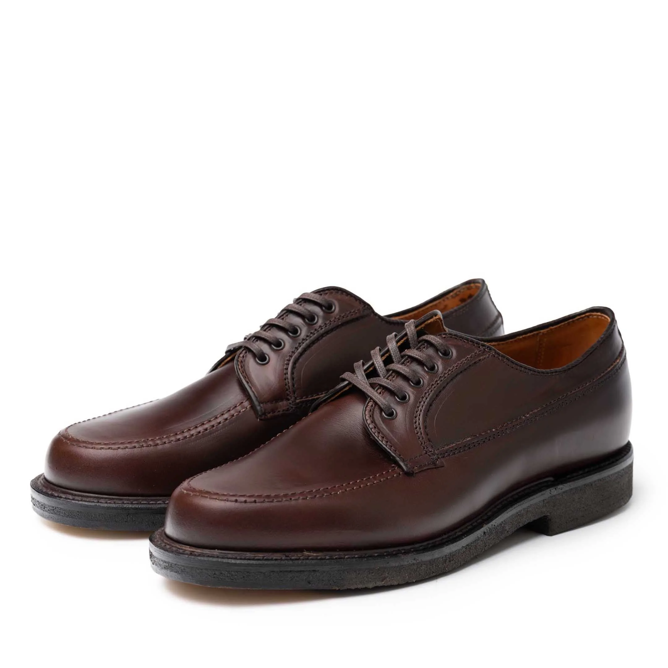 Alden has been producing Made in USA footwear for well over a century now. An icon of American footwear, Alden was founded in 1884 by Charles H Alden in Massachusetts and remains there to this day. The Alden Ranger Moc takes inspiration from traditional moccasin designs hailing from Maine, New England. Made exclusively for us here at Clutch, they feature a moccasin-toe blucher design with an all-around reverse welt, and a full leather lining and insole. The Sole is a natural 'plantation' crepe rubber and is goodyear welted with a brass-tacked leather toe portion. The M3612 is built on Alden's Van Last, with a D width fitting and also features five brass eyelets and is dual branded on the insole. For further information on sizing and fitting please visit our footwear size guide or drop us an email on info@clutch-cafe.com. Please note, we can only ship Alden to destinations within the UK and Europe. - Alden for Clutch Cafe - Ranger Moc style - Brown Horween Chromexcel - Goodyear welted plantation crepe sole - Van last - D width fitting - Tonal stitching - Leather lining & insole - 5 eyelets - Goodyear welted - Made in USA