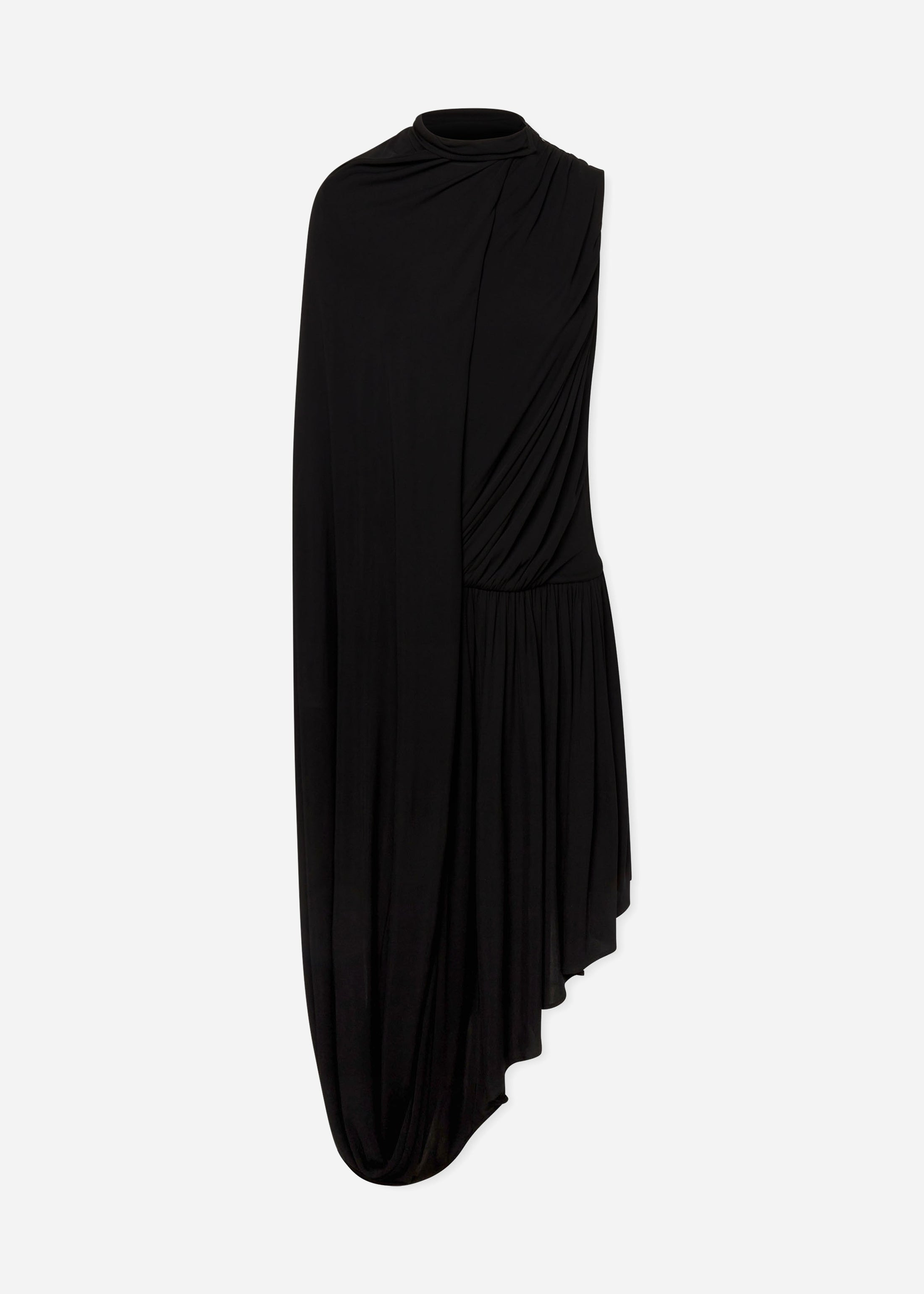 Minimalism with movement. Crafted from fluid black viscose jersey, this sleeveless dress features soft draping and an asymmetric hem for an architectural silhouette. Designed with subtle gathers at the shoulder and side for shape, and a relaxed fit that skims the body with ease. Details - Black - 100% Viscose - Dry Clean Only - 4746SJVI-PF25 Size & Fit - True to size. - Model is 5'10" and wears a size small