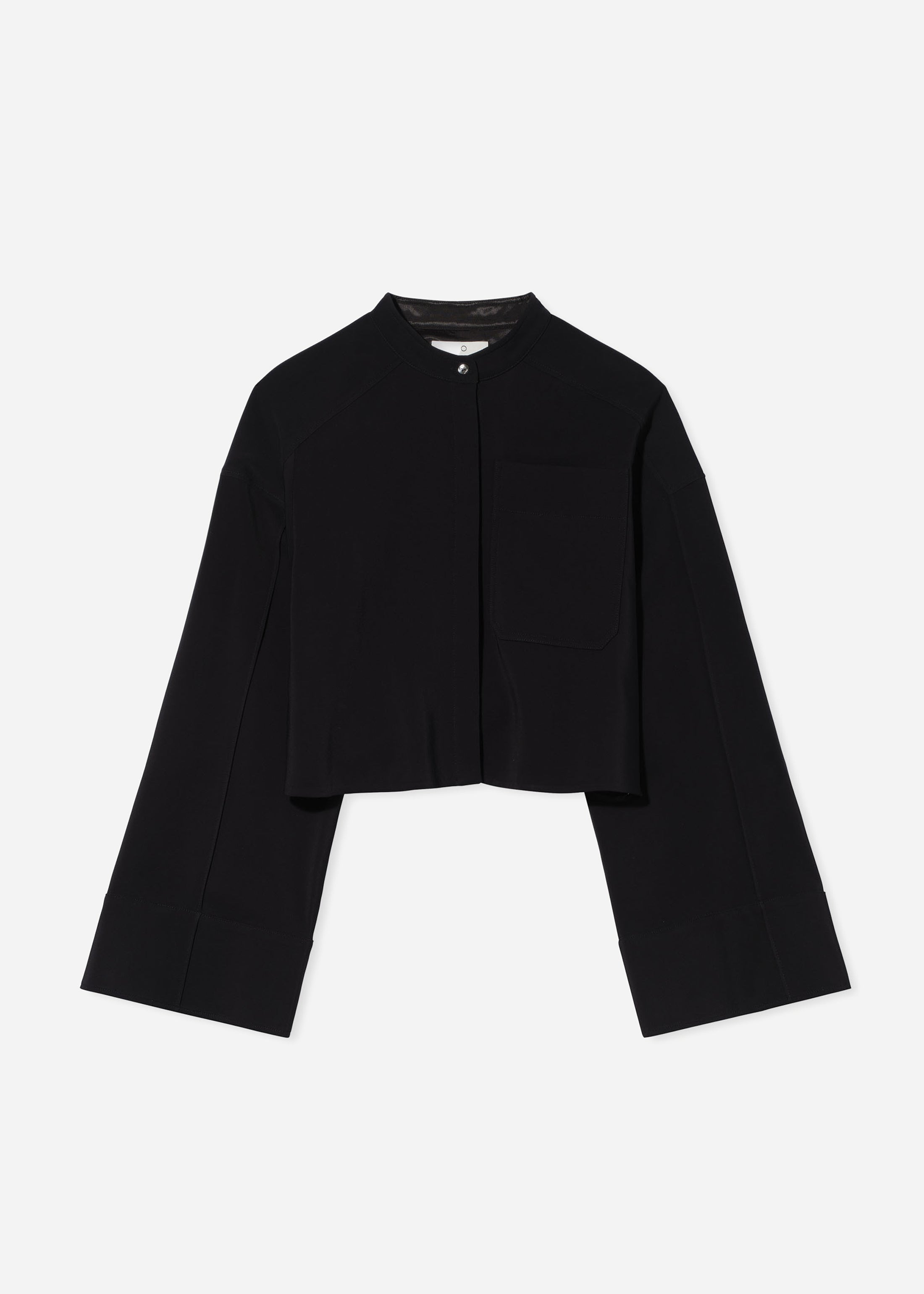 Cropped fluid blouse designed to be worn untucked with high-waisted pants. Elongating wide sleeves allow the fabric to drape beautifully with every movement. Stand collar, patch pocket shoulder, and mother-of-pearl buttons. Details - 97% Viscose 3% Elastane. - 1461MBND-ESSN Size & Fit - Relaxed it with extra long sleeves - Length grade is 1/2 between sizes. - Model is 5'10" 34" bust 26" waist wearing a size small.