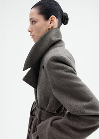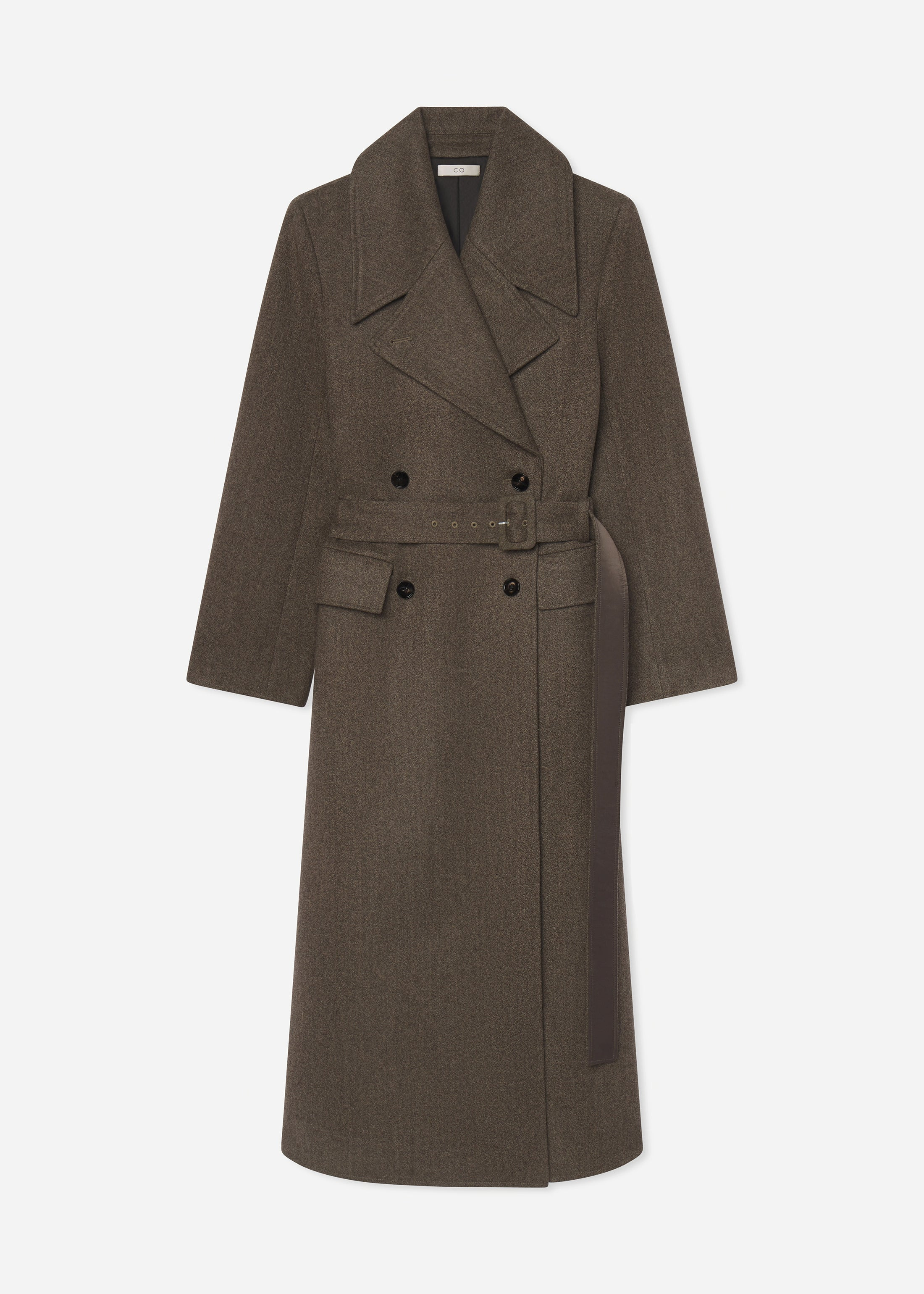 Tailored from a dense green melange wool, this long overcoat is designed with sharp peak lapels, structured shoulders, and a full-length silhouette that envelops without excess. The tonal belt with covered buckle cinches the waist to define the shape, while flap pockets and a single-button closure lend understated utility. Fully lined for comfort and ease. Details - Green Melange - 100% Virgin Wool - Fully Lined - Belted - Dry Clean Only - Style Number: 6542BSWC-F25 Size & Fit - Designed to fit oversized. - We recommend sizing down.