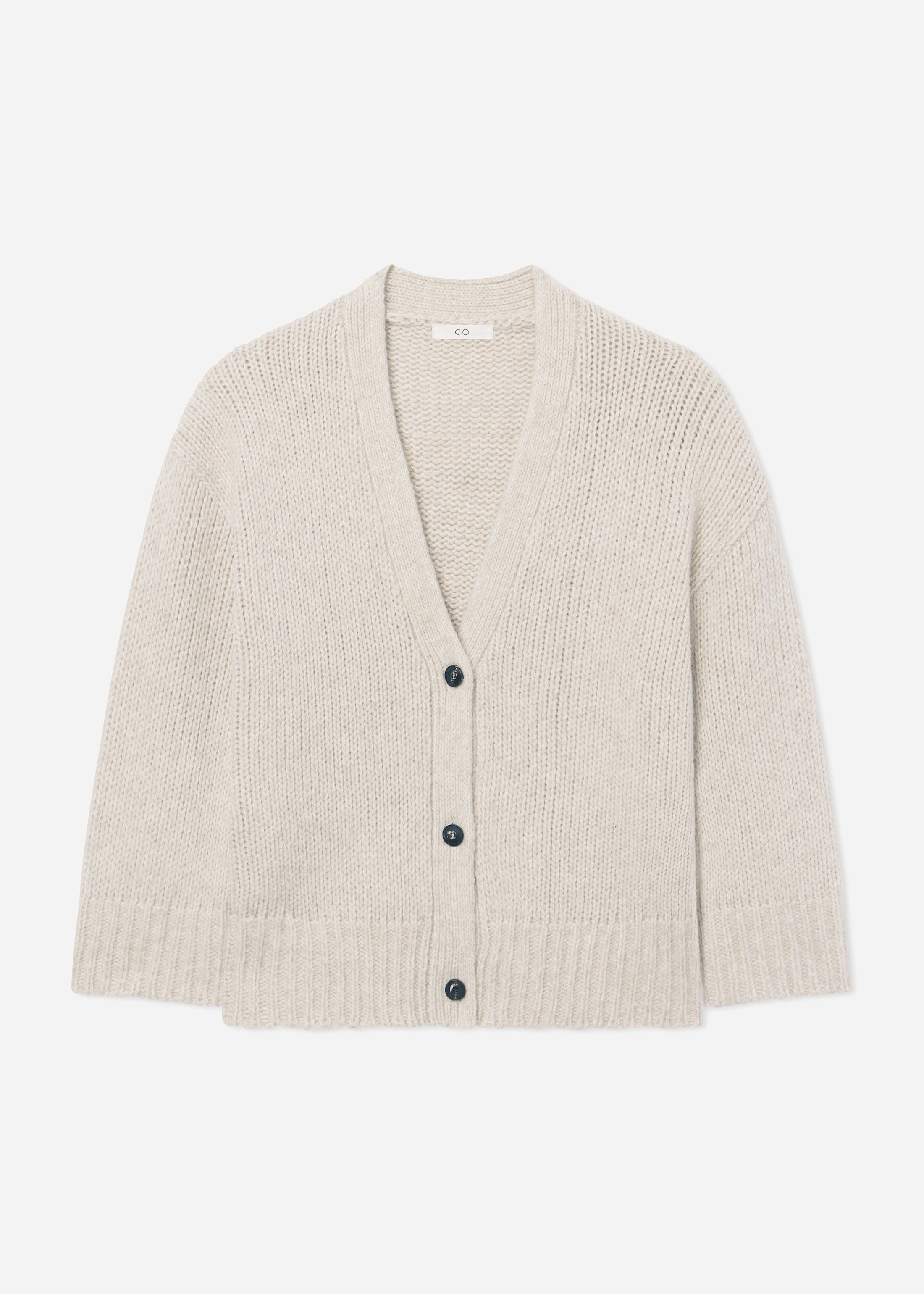 Laid-back luxury in a classic silhouette. This oversized boyfriend-style cardigan is knit in a soft jersey stitch from a two-ply cashmere silk blend. Designed with ribbed trim at the cuffs and hem, it drapes effortlessly while offering lightweight warmth. A timeless layering piece with understated polish. Dark horn buttons. Details - Arctic - 75% Cashmere 25% Silk - 7567TLAM-PF25 Size & Fit - Designed to be oversized - Model is 5'10" and wears a size small