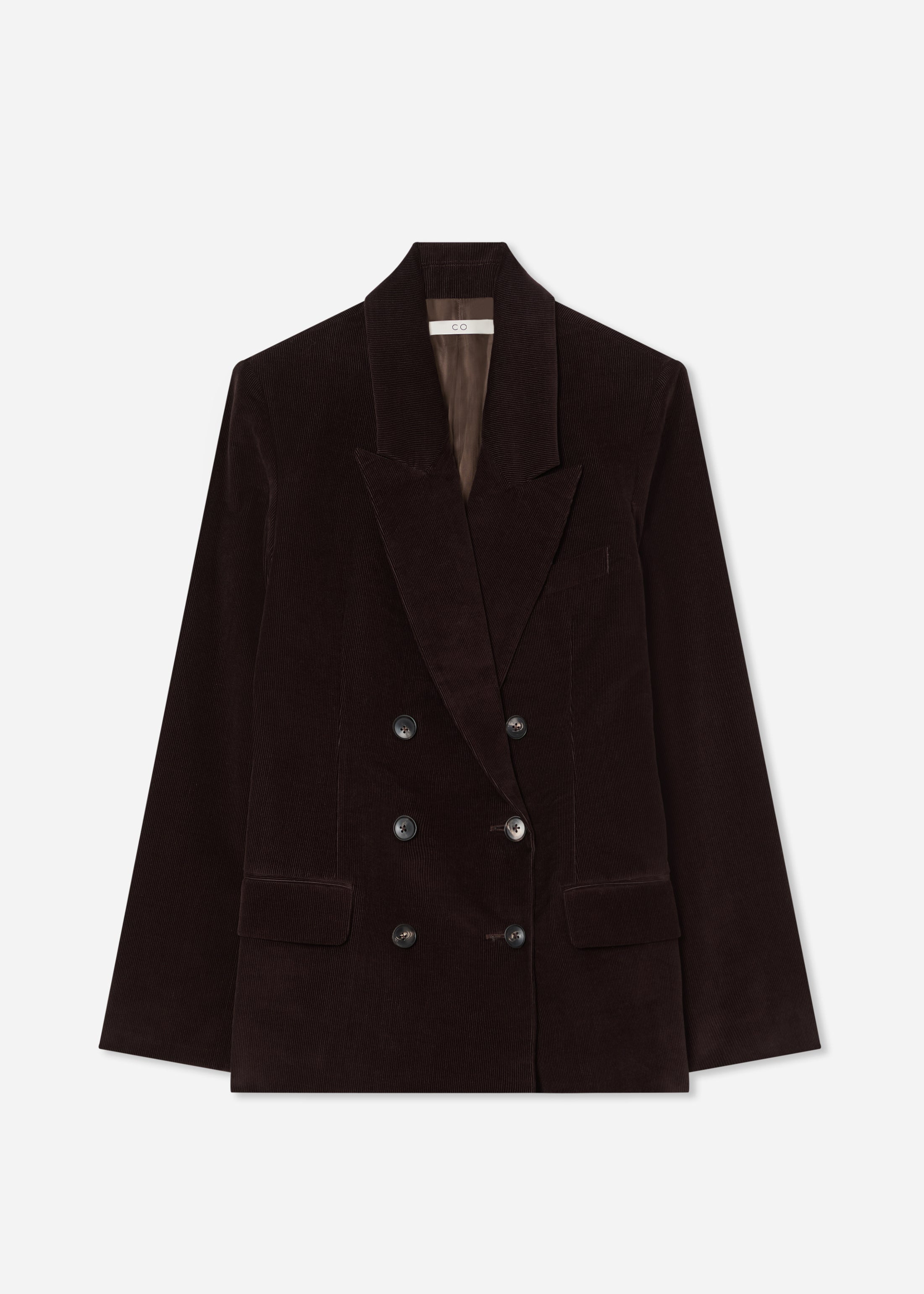 Tailored from supple, structured wide-wale corduroy, this double-breasted blazer features a strong shoulder line, sharp peak lapels, and front flap pockets. The elongated silhouette is gently cinched at the waist for a sculptural profile, offering a polished take on classic tailoring with a plush, tactile finish, dark horn buttons, fully lined. Details - Chocolate - 100% Cotton - Dark Horn Buttons - Fully Lined - Dry Clean Only - Style Number: 6795PCC-F25 Size & Fit - Fits true to size.