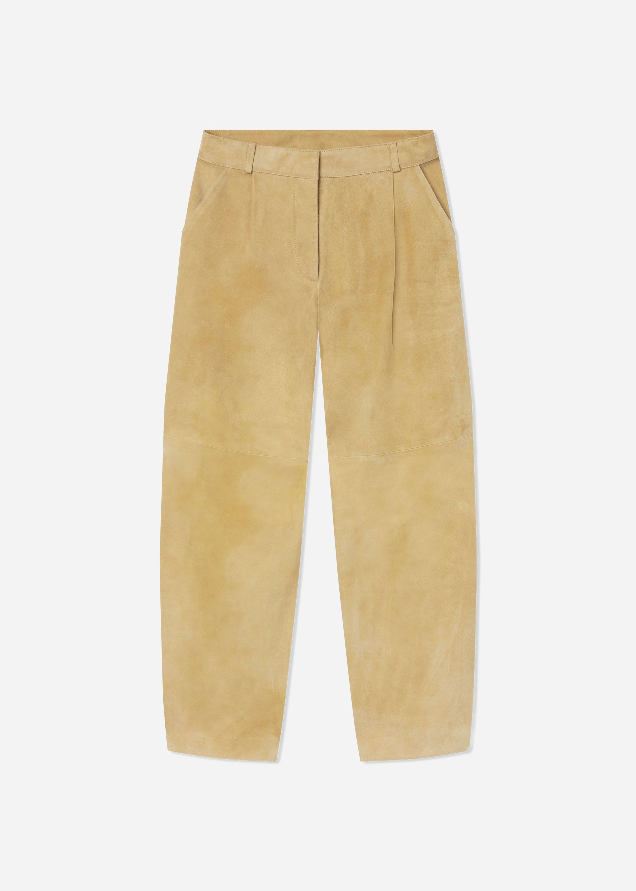 Tailored ease in soft structure. Expertly crafted from supple suede, these trousers feature a sculptural curved leg with a fitted waist and tapered ankle. Flat, wide pleats create a relaxed fit through the hips, while side pockets and a concealed metal zip add functional refinement. A modern silhouette with timeless appeal. Details - Camel - 100% Goatskin - Dry Clean Only - 5067AGS-PF25 Size & Fit - True to size. Determine size by waist measurement in size chart. - 29" inseam across all sizes