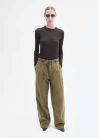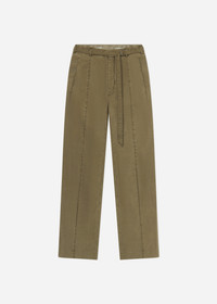Relaxed tailoring with utilitarian ease. These trousers are crafted from garment-dyed cotton in a rich deep olive, featuring a drop-waist silhouette with a soft drape. Designed with a built-in self belt with metal buckle, horn button, side pockets, and stitched front seams for added structure. A versatile pant that balances polish and comfort. Details - Olive - 100% Cotton - 5402SGDP-PF25 Size & Fit - Sits below belly button. Generous fit throughout hips and legs. - 31" inseam across all sizes