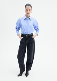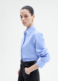 This fitted straight-cut shirt in crisp blue cotton poplin offers a refined silhouette enhanced by a hidden placket adorned with elegant mother-of-pearl buttons. The bias binding adds a subtle touch of craftsmanship, while the tailored design ensures a sleek fit that tucks effortlessly into skirts or trousers. Details - Blue - 100% Cotton - Dry Clean Only - Style Number: 1453LCSP-CORE Size & Fit - Measures 25" in overall length. - Relaxed fit. See size guide.