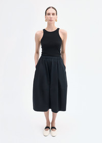 This elegant midi skirt in black cotton poplin features a comfortable elastic waistband that ensures a perfect fit. Its gathered design creates a voluminous silhouette, enhancing movement and grace. The tiered wide cuff at the hem adds both structure and a refined flair, making it a standout piece in any wardrobe. Ideal for pairing with tucked-in tank tops or breezy blouses. Details - Black - 100% Cotton - Elasticated Waist - Dry Clean Only - Style Number: 3513LCSP-CORE Size & Fit - Total length 30" across all sizes. - A size Small measures 26" in the waist