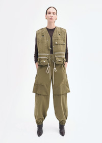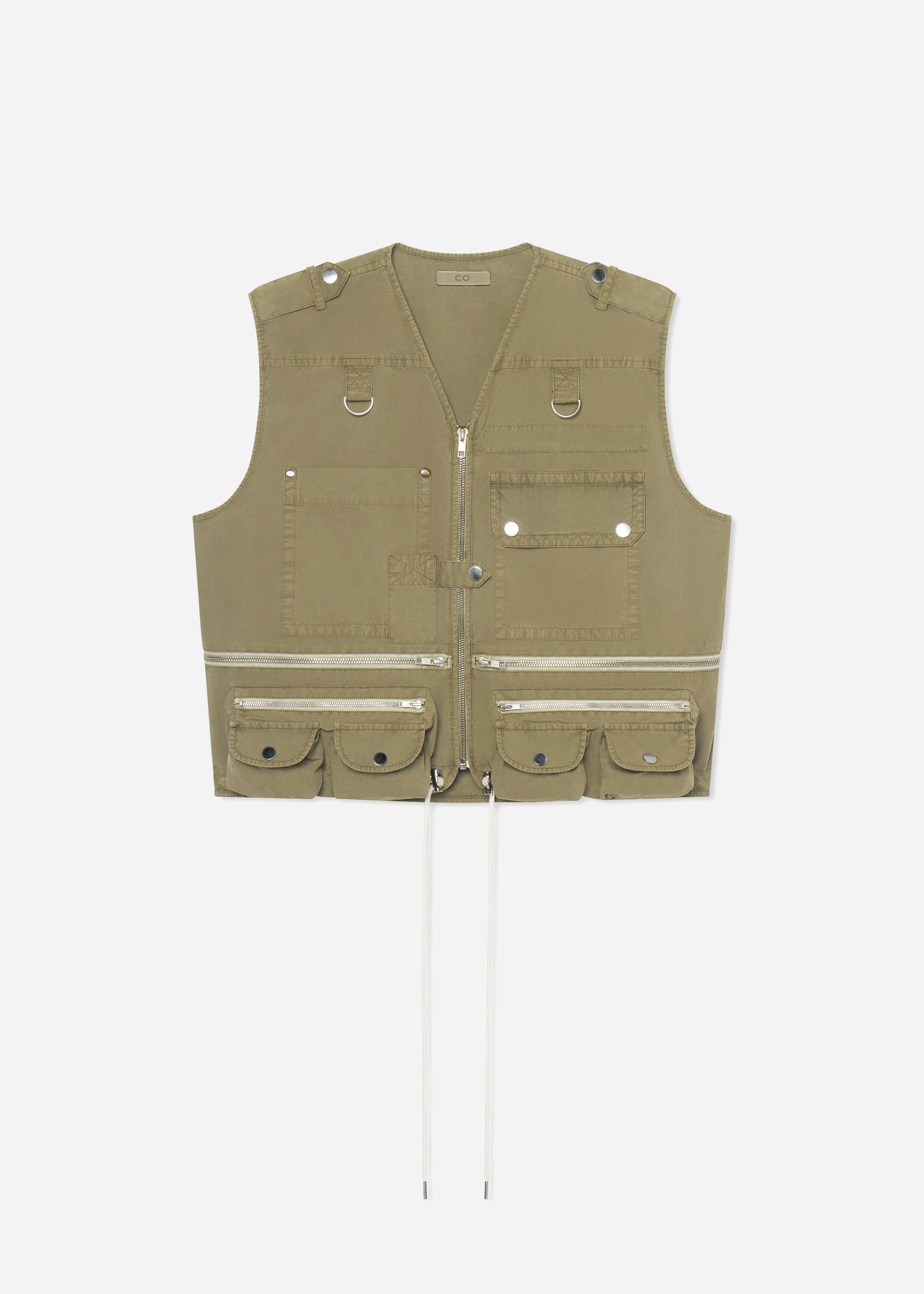 A functional layer with military-inspired detailing. This gilet is crafted from garment-dyed cotton for vintage, broken-in feel and olive khaki tone. Designed with multiple utility pockets, metal zip closures, and D-ring hardware, it features an adjustable drawcord hem for a customizable fit. Perfect for layering over knits or outerwear with utilitarian edge.> Details - Olive - 100% Cotton - 9370SGDP-PF25 Size & Fit - True to size. - Model is 5'10" and wears a size small