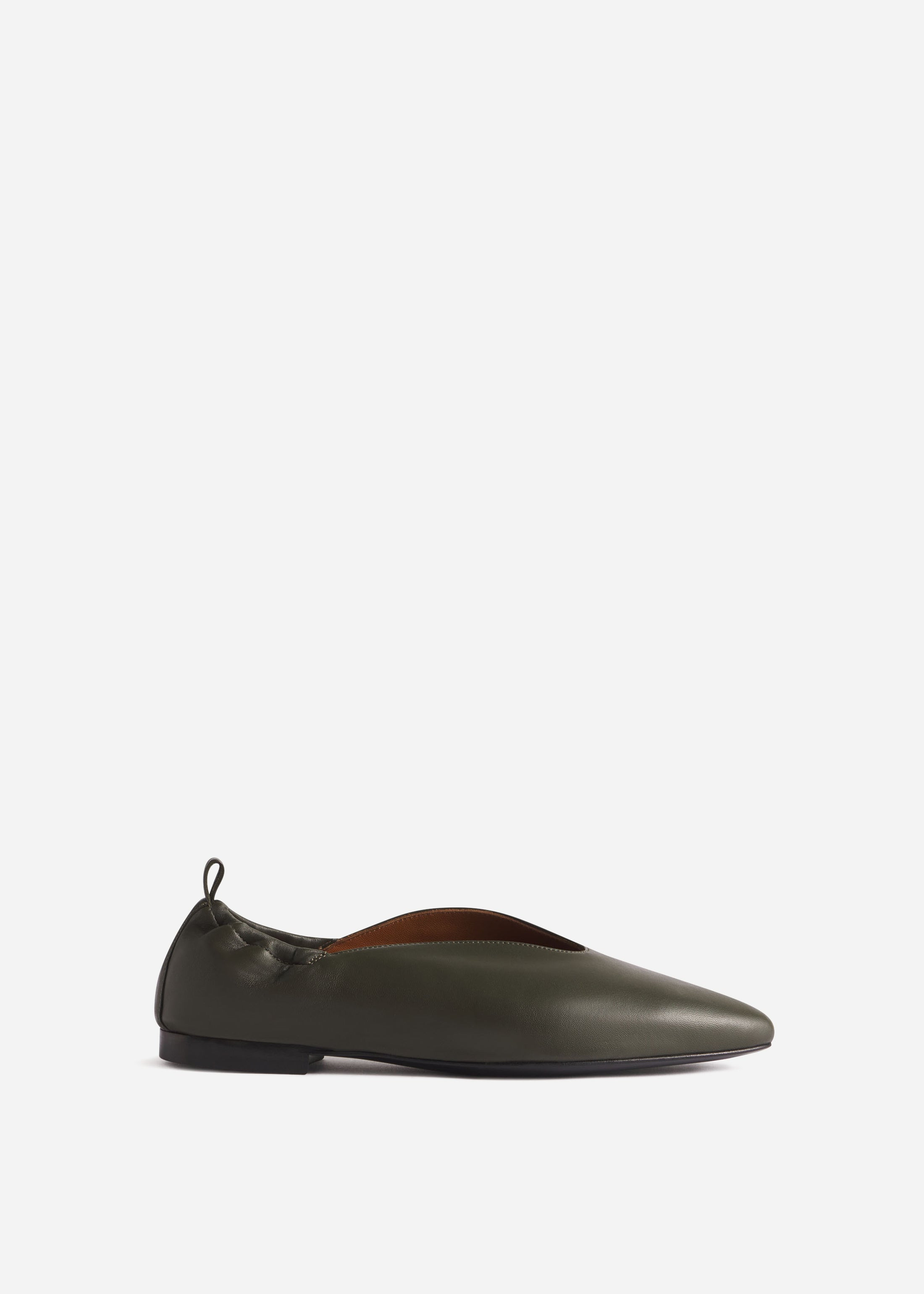 Designed with a padded sole for exceptional comfort during prolonged wear, this flat showcases smooth calfskin leather that delivers a rich texture and lasting resilience. It features a sleek pointed toe, an elasticized heel for a secure fit, and pull tabs that add both convenience and a subtle touch of style. Expertly crafted in Italy, this shoe represents timeless elegance and superior craftsmanship. Details - Olive - 100% Leather - Made in Italy - Style Number: 0062NAP-PF25 Size & Fit - True to size - Engineered with a narrow last and an elasticized heel counter to enhance fit adaptability and rear foot support.