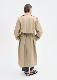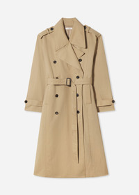 This reimagined trench offers a relaxed, architectural silhouette with timeless appeal. Crafted from a water-resistant cotton twill blend, it features a dropped shoulder, oversized fit, and midi length. Finished with a self belt and leather-covered buckle, horn buttons, and full lining for year-round wearability. Details - 69% Cotton 31% Nylon - 6043WRT-CORE Size & Fit - Runs big. We recommend sizing down. - Approx 50" in total length - Model is 5'10" and wears a size Small.