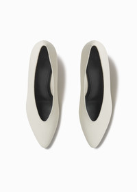 Crafted in Italy from supple calfskin, these pointed ballerina pumps embody quiet refinement. The soft ivory tone lends understated sophistication, while the sculpted silhouette and subtle sheen evoke timeless elegance with modern ease. Details - White - 100% Calfskin Leather - 55mm kitten heel - Made in Italy - Style ID: 0186AGN-IVO Size & Fit - We recommend sizing down a half size. - 55mm kitten heel - Softly pointed toe and low-profile silhouette elongate the foot