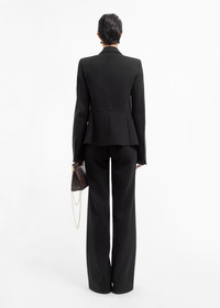 A study in precision tailoring. This single-button blazer is crafted from 100% cotton for a clean, structured drape that balances formality with ease. Designed with refined proportions, it features a softly contoured waist, notched lapels, and flap pockets. Fully lined for a smooth fit. Details - Black - 100% Cotton - Dry Clean Only - Style Number: 6279VWCS Size & Fit - Fits true to size. - Structured shoulder and contoured waist for a defined shape - Measures 26.5" from shoulder to bottom hem - Model Height is 179 cm / 5'11 in
