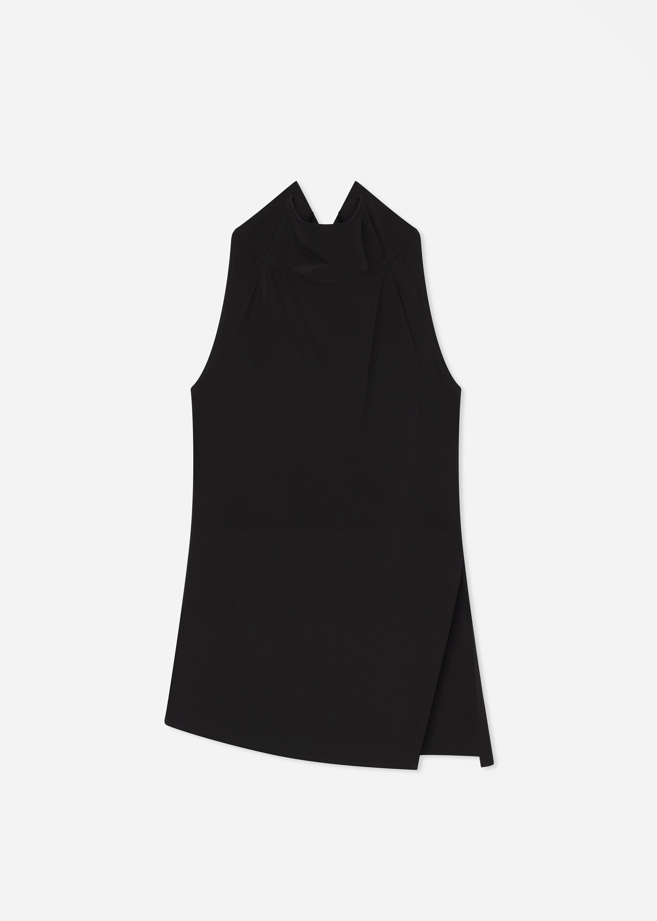 A tailored evening top in viscose-wool suiting with refined matte finish. The sculptural neckline drapes gracefully at the front, while a clean, asymmetrical hem lends architectural balance. Finished with an invisible back zip. Details - Black - 74% Viscose 26% Virgin Wool - Cowl Neck - Back Zipper - Dry Clean Only - Style Number: 1312BVW-F25 Size & Fit - Close fit to the body. - 28" in total length across all sizes