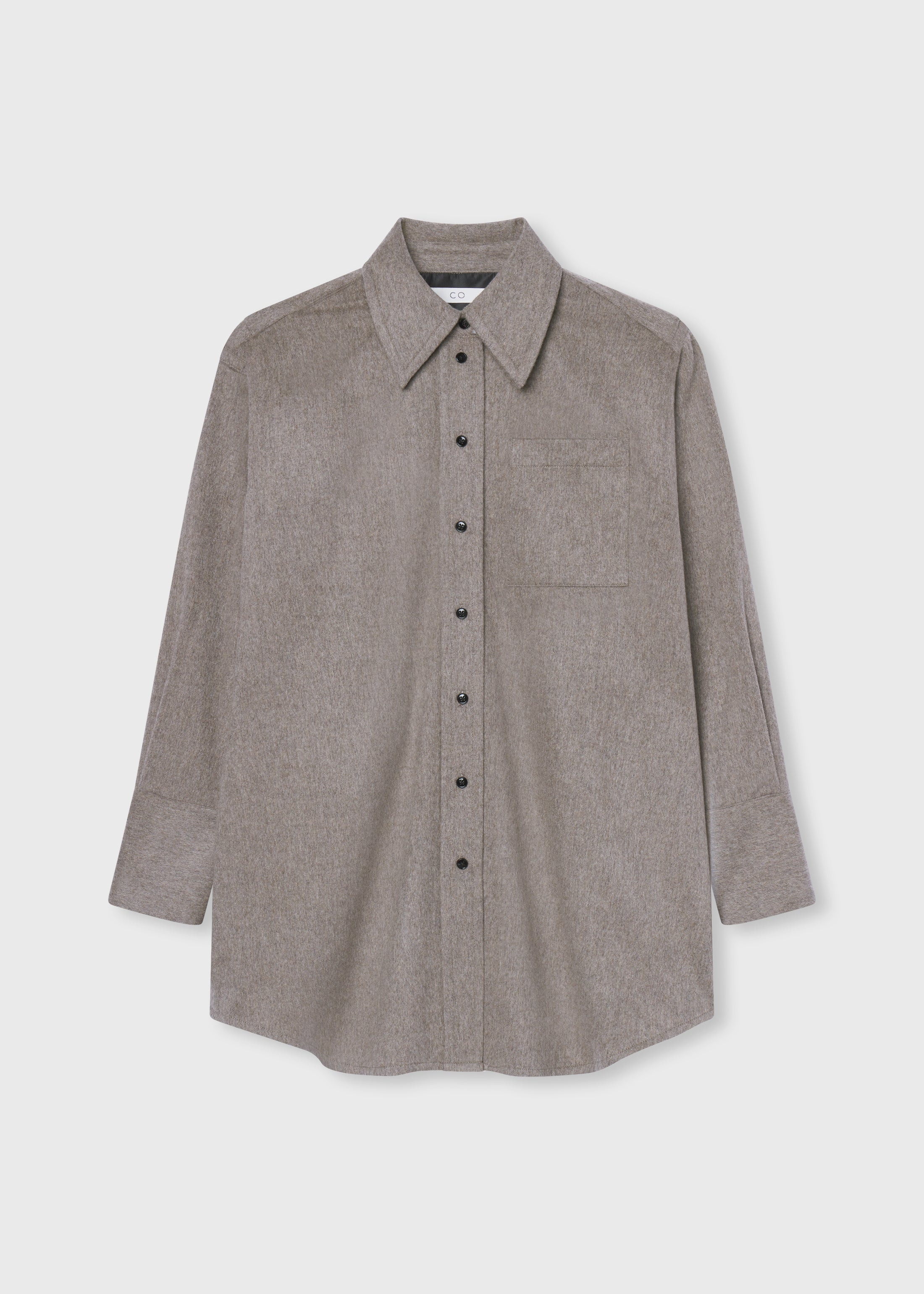 Tailored in a soft wool-cashmere blend, this oversized shirt offers structure with a plush, tactile finish. Designed with a classic point collar, single chest pocket, and tonal buttons, it’s a refined take on menswear-inspired shirting. Wear it layered or as a standalone piece for a look that balances ease and polish. Details - Oatmeal - 90% Virgin Wool 10% Cashmere - Dry Clean Only - Style Number: 1730BWCF-F25 Size & Fit - Runs long. - Designed to be slouchy. - Size down if you are petite.