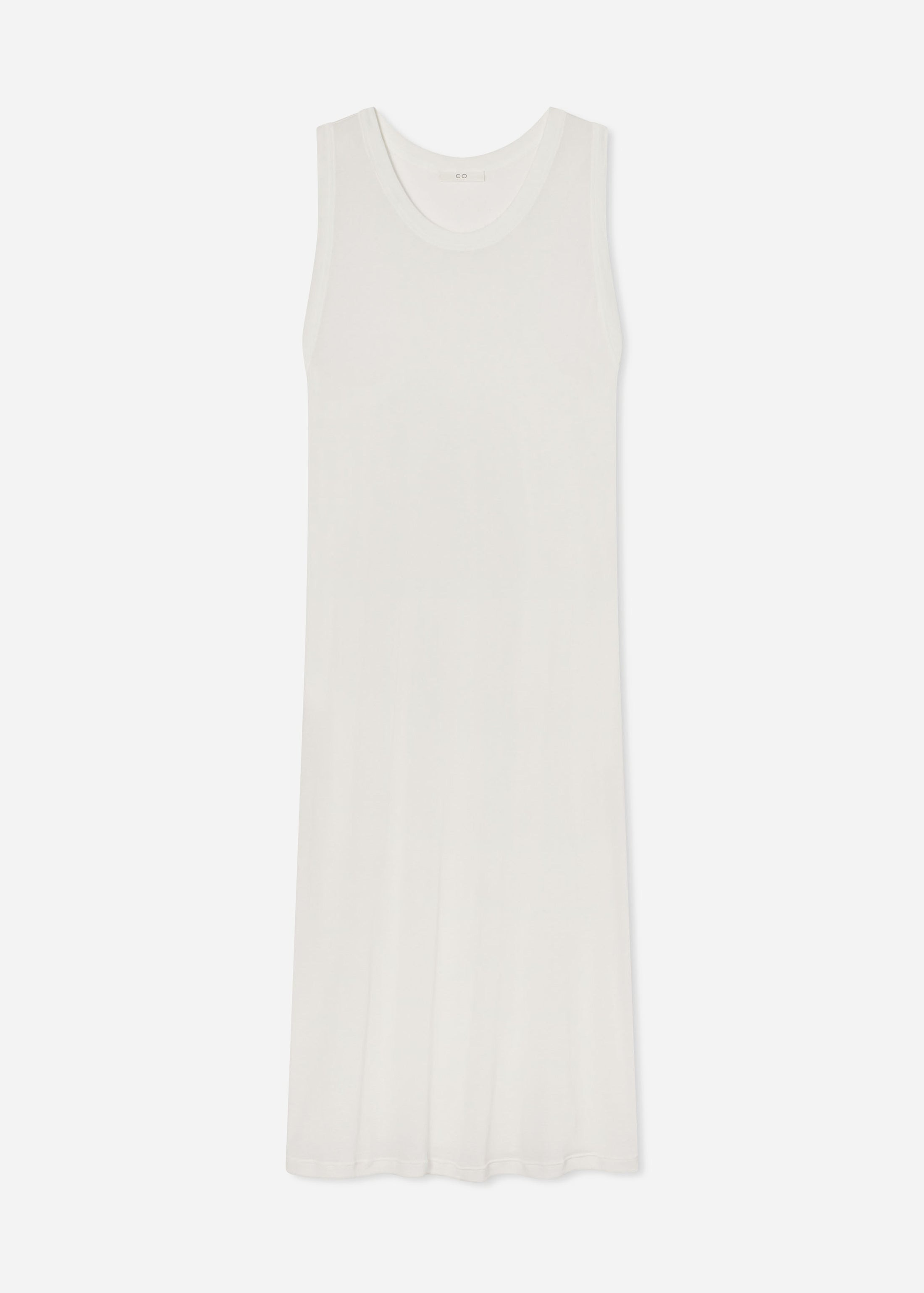 A lightweight tank dress crafted from sheer cotton jersey with a softly draped silhouette and minimalist finish. Designed with a scoop neckline and exaggerated armholes, it skims the body for an effortless, barely-there feel. Ideal for layering or warm-weather ease. Fits true to size. Details - 4728NCR-CORE - 100% Cotton - White Size & Fit - Relaxed fit