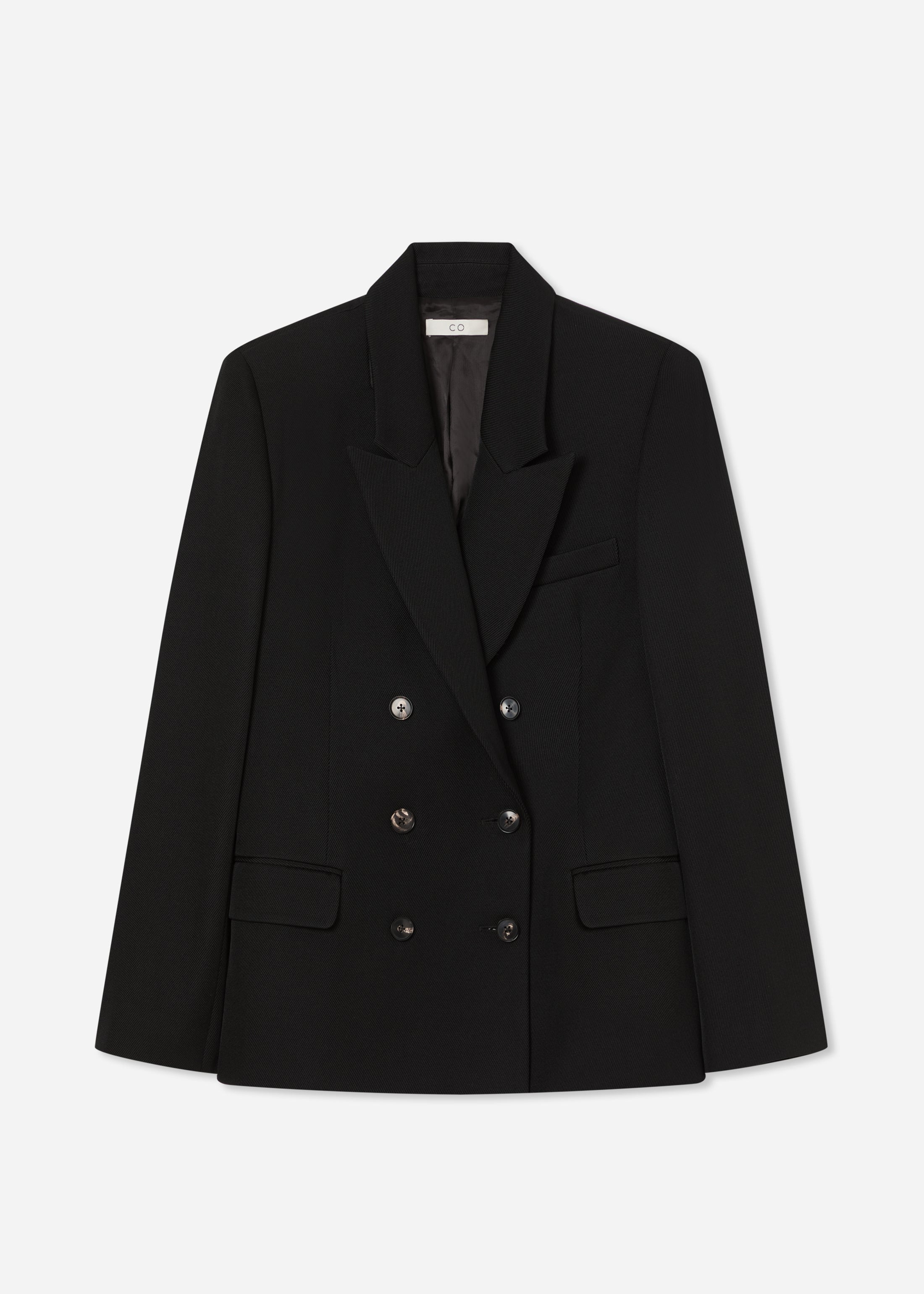 Tailored in compact virgin wool twill, this double-breasted blazer features strong shoulders, peak lapels, and a full lining for structured drape. The silhouette is sharp yet timeless, with horn-style buttons and flap pockets that echo classic menswear tailoring. A wardrobe essential elevated by crisp fabrication and precise construction. Details - Black - 100% Virgin Wool - Peak Lapels - Fully Lined - Dry Clean Only - Style Number: 6795BWD-F25 Size & Fit - Designed to be fitted in the waist - Relaxed fit throughout shoulders