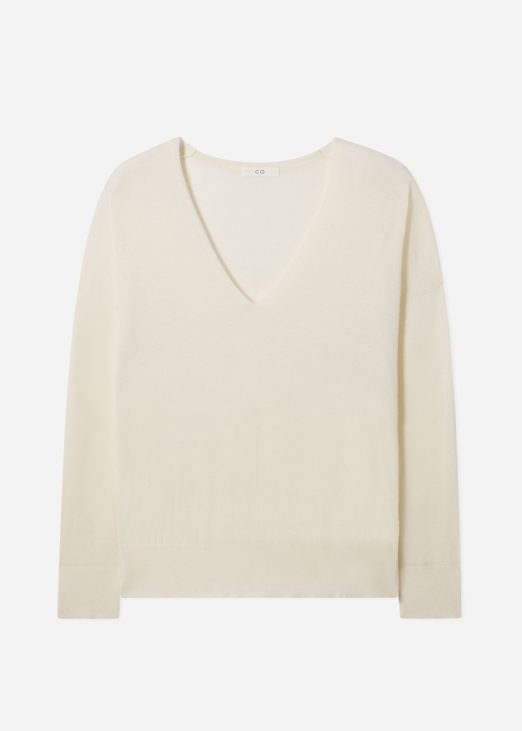 This elegant V-neck sweater in fine cashmere offers a relaxed fit that combines comfort with refined style. Crafted from soft, fine-gauge cashmere yarn, it features a graceful drop shoulder and a softly draped back that enhances its sophisticated silhouette. The ribbed hem adds subtle structure, making it an ideal layering piece for both casual and polished looks. Details - Ivory - 100% Cashmere - Ribbed Hem - Dry Clean Only - 7891BCM-CORE Size & Fit - Designed with a relaxed fit. - We recommend ordering one size down if you prefer a fitted look.
