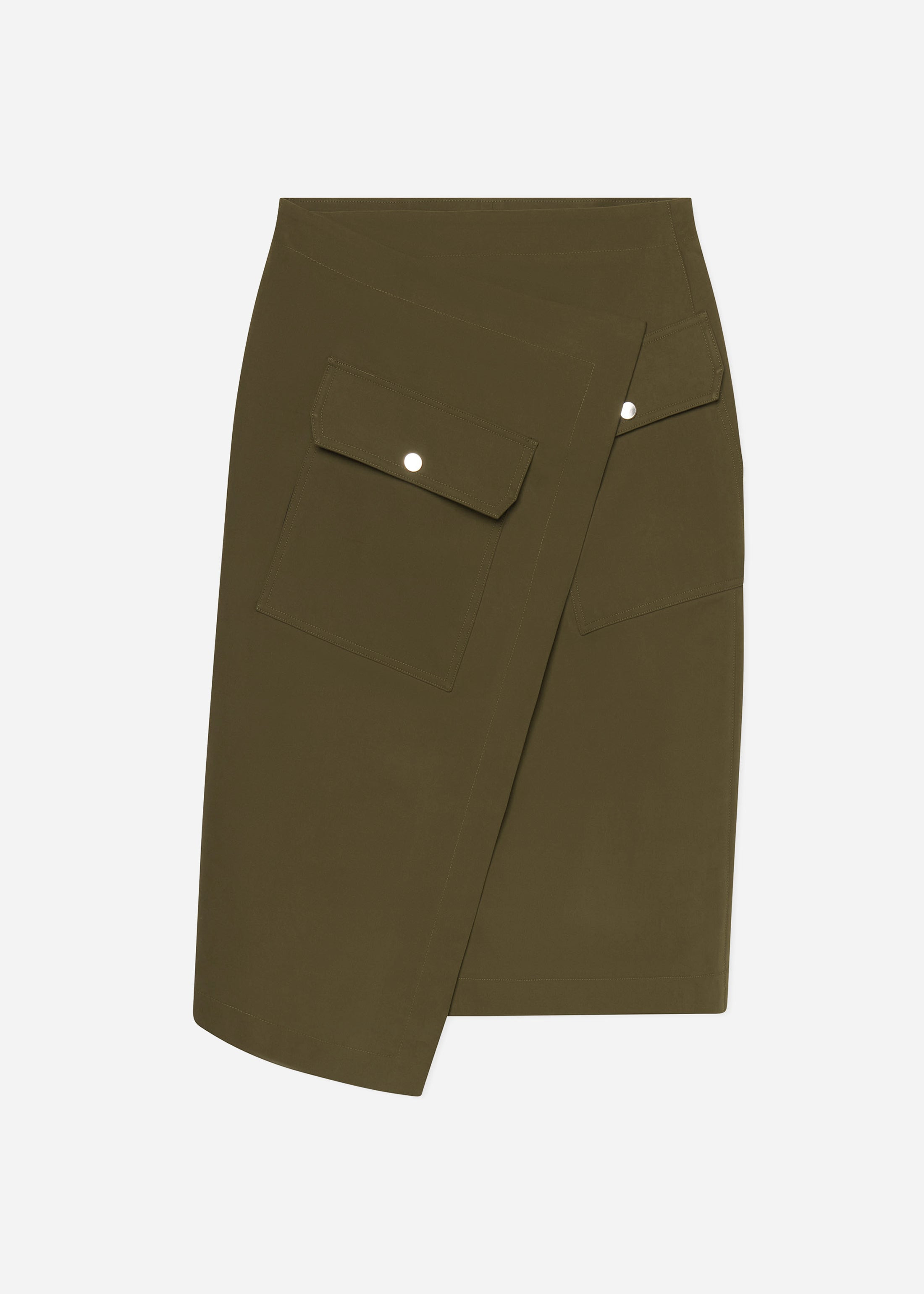 Utility with a modern edge. This structured wrap skirt is crafted from brushed cotton twill and designed with an asymmetrical front overlay and oversized flap pockets. The clean silhouette and matte olive finish give it a grounded, utilitarian feel—perfect for pairing with fitted knits or relaxed tailoring. Details - Olive - 100% Cotton - Dry Clean Only - 3051EBC-PF25 Size & Fit - True to size. - Model is 5'10" and wears a size small