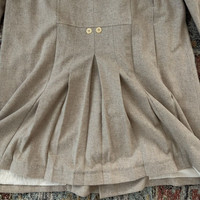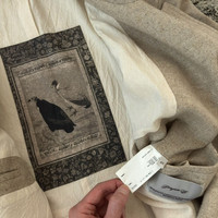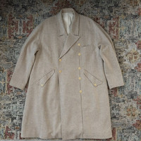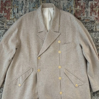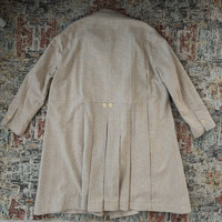 Professor E AW22 Edwardian coat in beige / off white, men's size 46 (fits oversized). Wool blend overcoat featuring peak lapels, double breasted closure, signature Professor E style button flap hand warmer pockets, upper left chest pocket, single button sleeve cuffs, inner chest pocket, intricate pleating on back center, full cotton lining, and design that features exposed cotton lining beneath vertical buttons / bar tacks. In pristine preowned condition; cleaned once and worn once after. Comes with original tag and receipt. Width 63cm Shoulder width 57cm Sleeve length 60cm Length 107cm lookbook pic of same coat but with different material/color