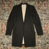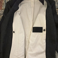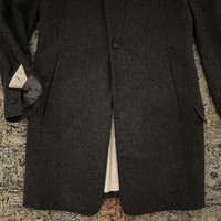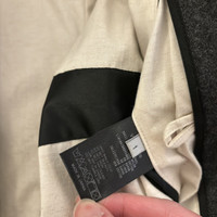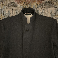 The Viridi-Anne AW15 Chester Coat in charcoal grey, men’s size 1 (fits like men's size XS). VI-2410-06. Originally $750. One button main closure with collar button fastener. Single notch lapel. Above knee length. Slash pockets on front. Flap pockets on back. Side entry inner chest pockets. Extended back vent. Concealed single button on sleeve cuffs. Flannel has been hardened with special chemical processing to create a texture similar to melton wool. In pristine preowned condition; has been worn once since cleaning. General wear. Width 47cm Shoulder width 43cm Sleeve length 62cm Back length 85cm