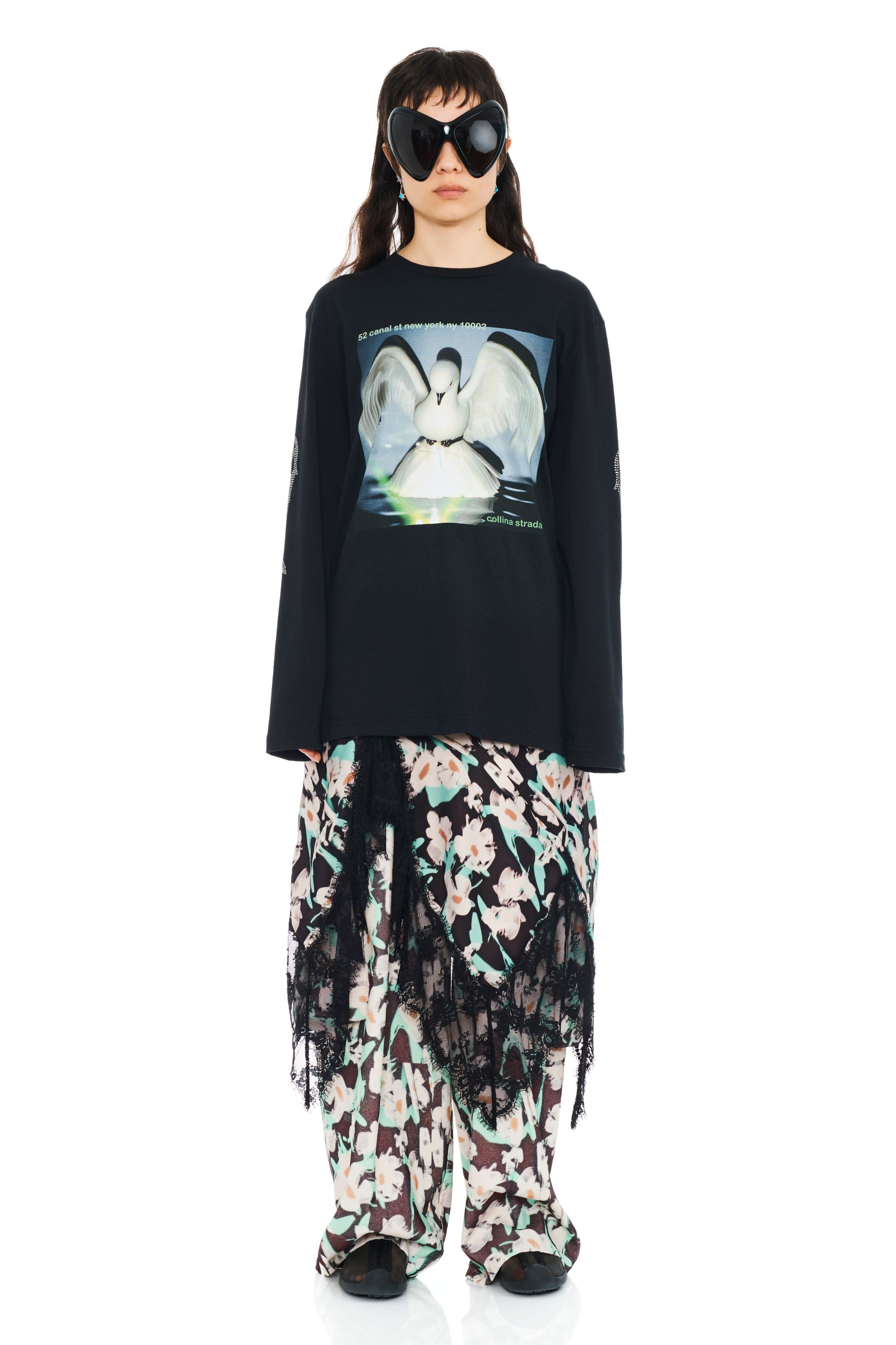 Long sleeve tee with custom Collina Strada 52 canal graphic and rhinestone tattoo on the sleeves. 100% Organic Cotton Model wears Large Made in New York Oversize boyfriend fit XS=00-0, S=2-4, M=4-6, L=6-8, XL=10-12