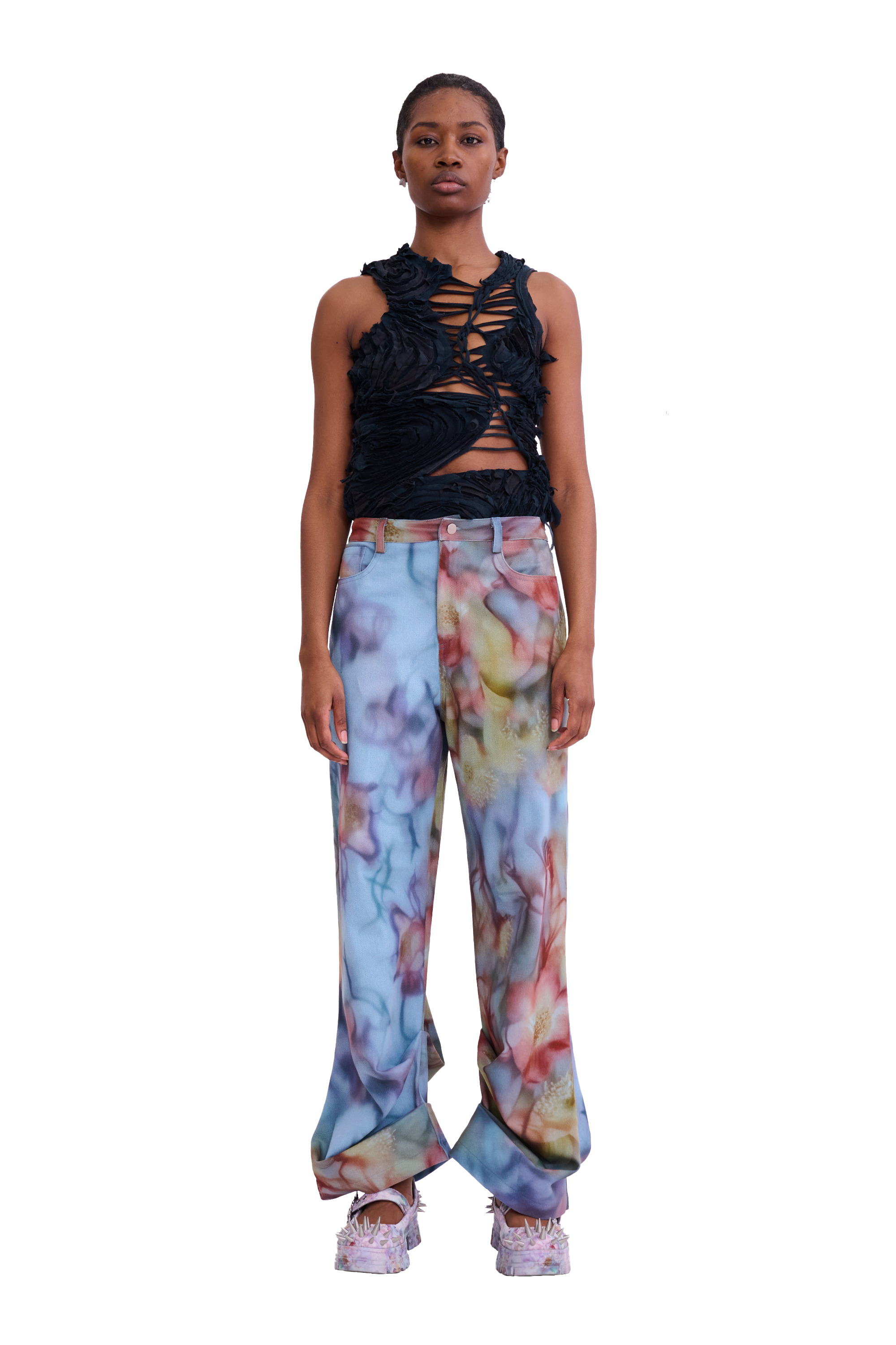 Relaxed fit mid-rise jean with draped hem. Collina Strada's Barbed Floral printed denim. 100% Cotton Made in New York Model wears a size Small Print placement may vary