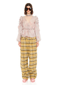 Long sleeve wrap top with delicate ruching and artful draping effect sleeves and sides. Chiffon, semi-sheer. 100% Silk Model wears size small and is 5'11''. - Wrap top - Long Sleeves - Made in the USA - XS=00-2, S=2-4, M=4-6, L=6-8, XL=10-12