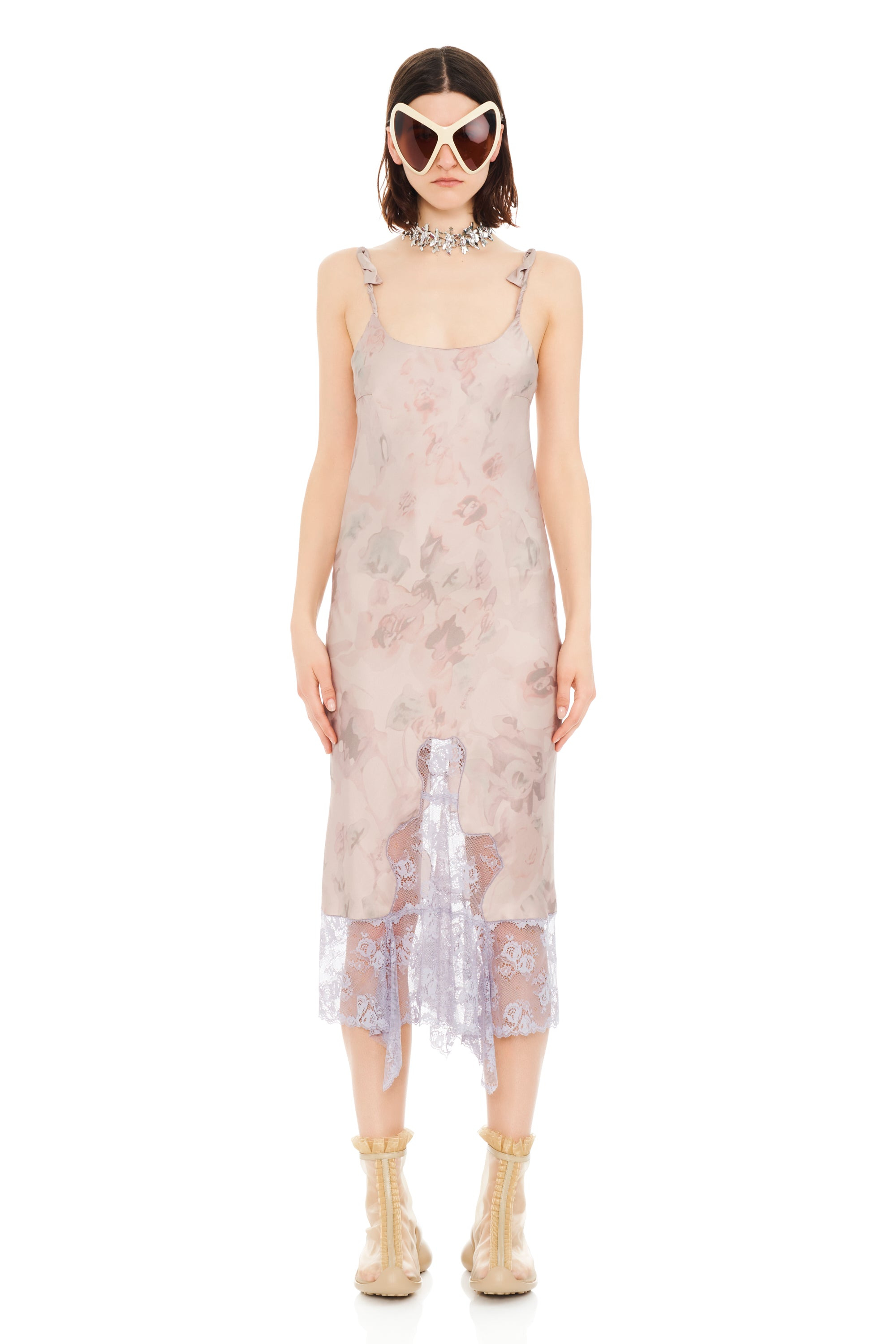 Slip dress with deadstock lace edges and a slight stretch with adjustable straps. Custom Collina printed beige watercolor roses satin. Twisted straps. 78% Acetate 22% Polyester and 100% Deadstock polyester lace Made in New York Model wears size small