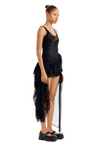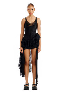 Slip dress with ruffles and gathered, draped hem and abstract panels of lace and chiffon. Satin bodice with deadstock chiffon and lace trims. Asymmetrical hem. Made in New York Model wears a size Small - Slips on over head - Scoop neck - Sleeveless - 100% acetate with 100% recycled silk, 100% recycled nylon and 51% nylon, 49% recycled nylon contrasts - Dry clean - True to size XS=0, S=2-4, M=6-8, L=8-10