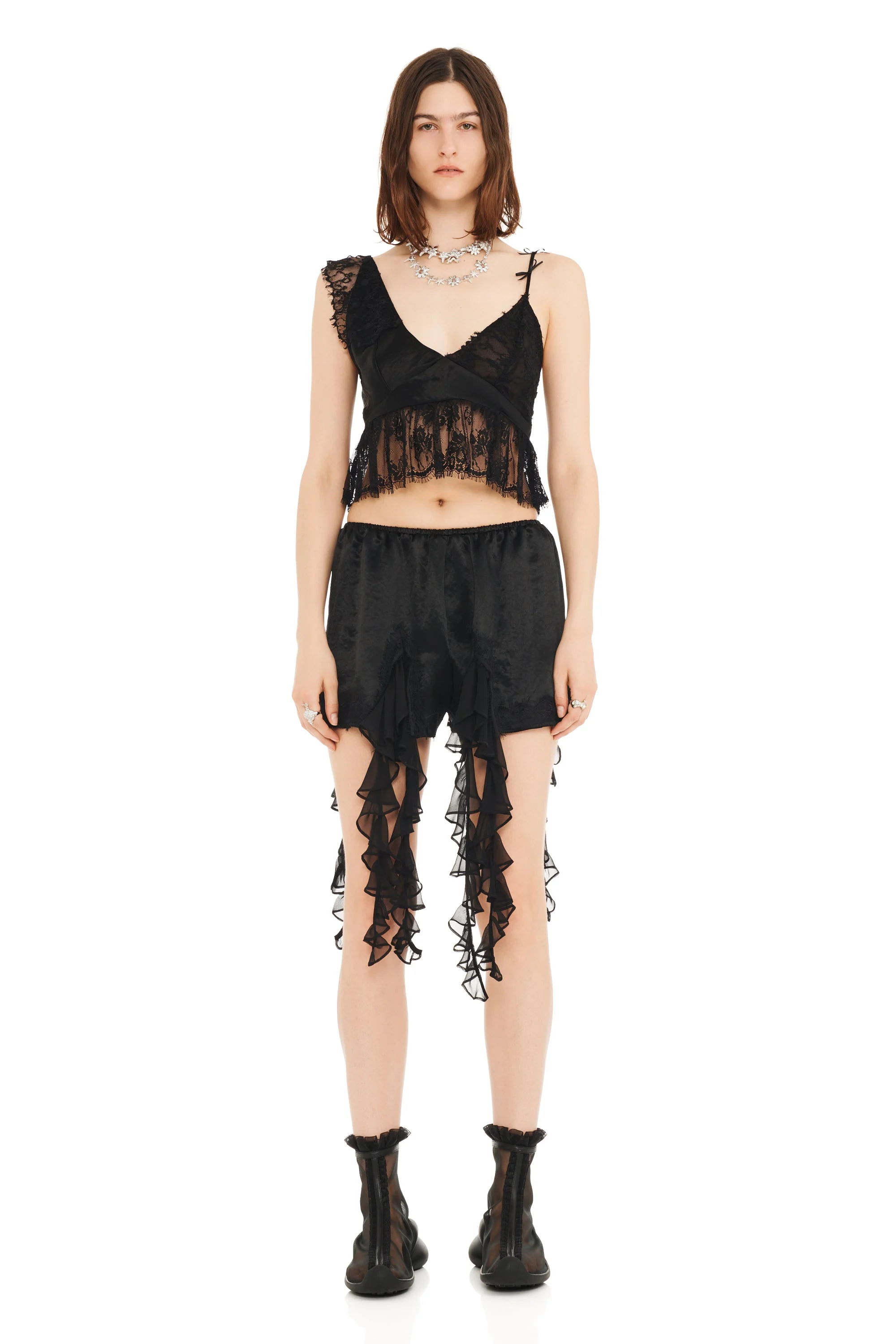 Mini satin boxer-style shorts with lace layers and silk tendrils. 100% Eco Acetate, 100% Silk, and 49% Recycled Nylon 51% Nylon Made in New York - True to size - Model is 5'11" and wears size S - XS=0-2, S=2-4, M=4-6, L=6-8, XL=10-12