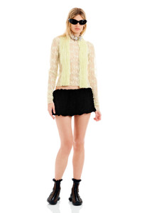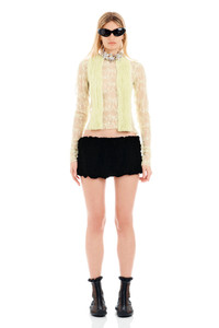 Velvet mini-skirt with intricate smocking detail. Lined. Side seam zipper. 20% Viscose 80% Nylon Model wears a small and is 5'9''. Made in New York - True to size. - XS=00-0, S=0-2, M=2-4, L=6-8, XL=10-12.