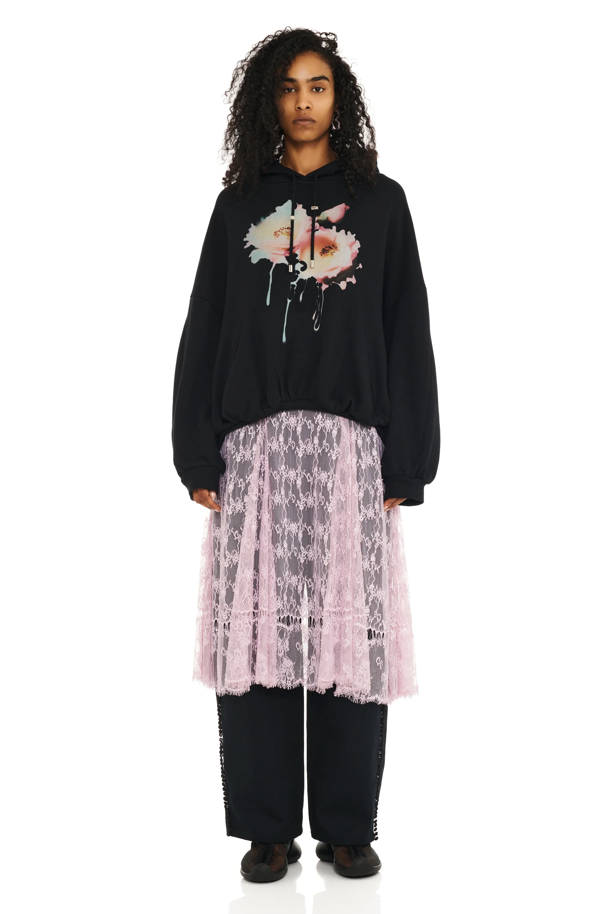 Oversized hoodie with printed abstract floral design at front. Side pockets. 100% Deadstock Cotton Made in Portugal True to size Model wears size M and is 5'10" - XS=0-2, S=2-4, M=4-6, L=6-8, XL=10-12