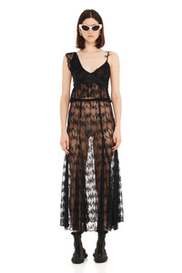 Black lace 7/8 ankle skirt. Size zip with godets, grosgrain waistband. Great for layering! Model wears size Small and is 5'11'' Made in New York Fits true to size 49% Recycled Nylon 51% Nylon