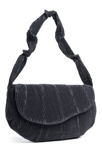 Textured satin bag with flap closure and sculptural strap. Zipper closure and interior pocket. Lined in cotton and grape faux leather. 100% Acetate 16x10.5x2.5", Strap 36" Made in India