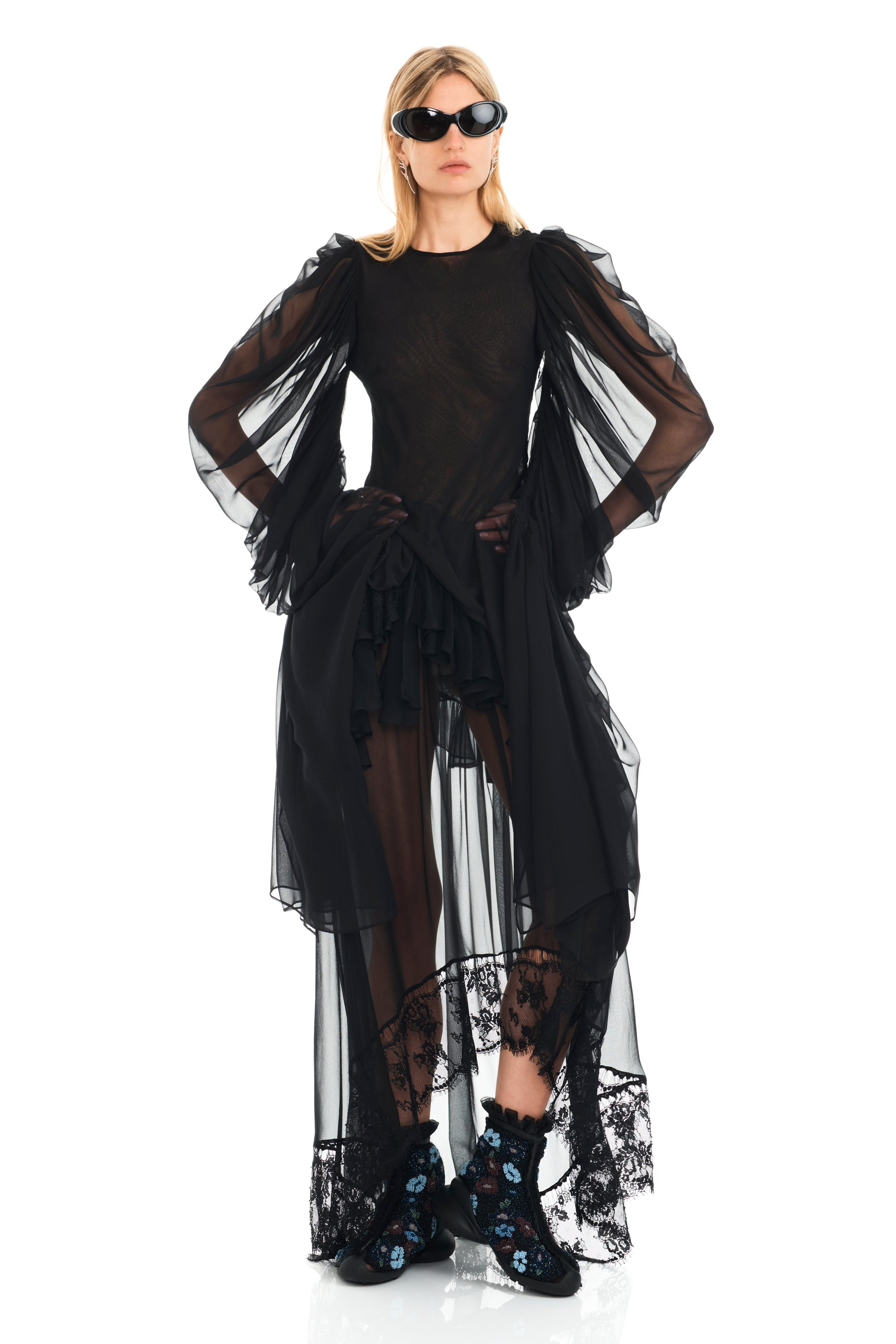 Full length silk chiffon dress with maxi sleeves with ruffles and lace details Model wears a small and is 5'11''. 100% Silk and 51% Nylon 49% Recycled Nylon Made in USA - True to size. - XS=00-0, S=2-4, M=4-6, L=6-8, XL=10-12.