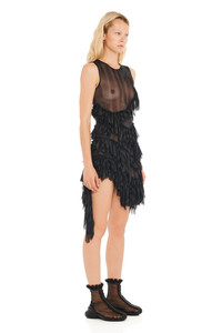 Sleeveless layered and gathered mesh dress with an asymmetrical hem. Sheer. Stretch mesh. 95% Polyester 5% Spandex Made in New York - True to size - Model is 5'9" and wears size S - XS=0-2, S=2-4, M=4-6, L=6-8, XL=10-12 Print placement may vary.