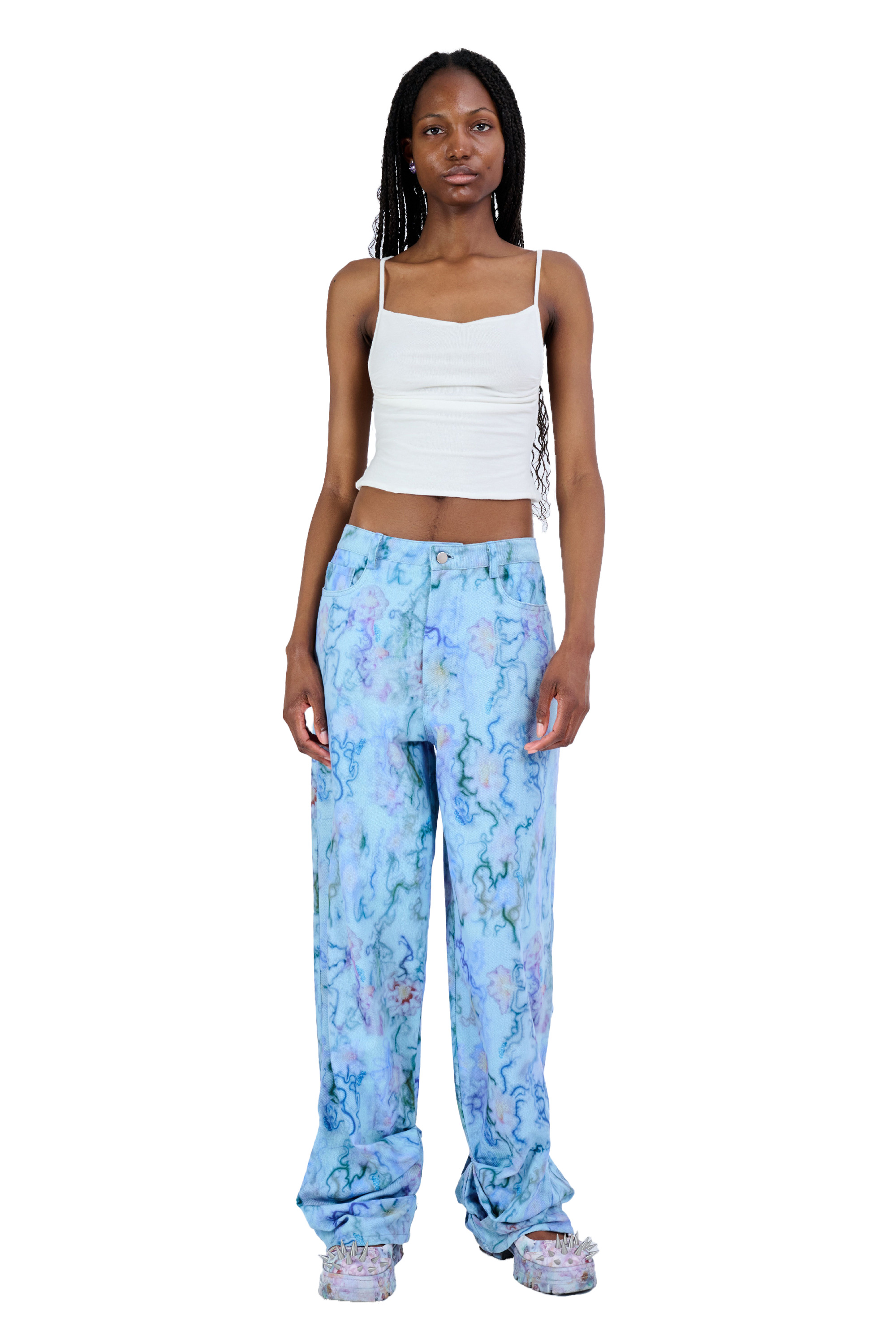 Relaxed fit mid-rise jean with draped leg. Collina Strada's AI-generated Blue Thorn print. 100% Cotton Made in New York Model wears a size Small Print placement may vary