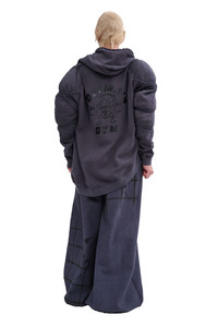 Oversized muscle hoodie with exaggerated, puffy sleeves. Front kangaroo pocket, drawstrings at the neck, and an asymmetrical hem. The back of the hoodie has CS GYM graphic design. Muscle pads are removable. 100% Deadstock Cotton Fleece Made in Portugal Model wears size Medium Oversize fit.
