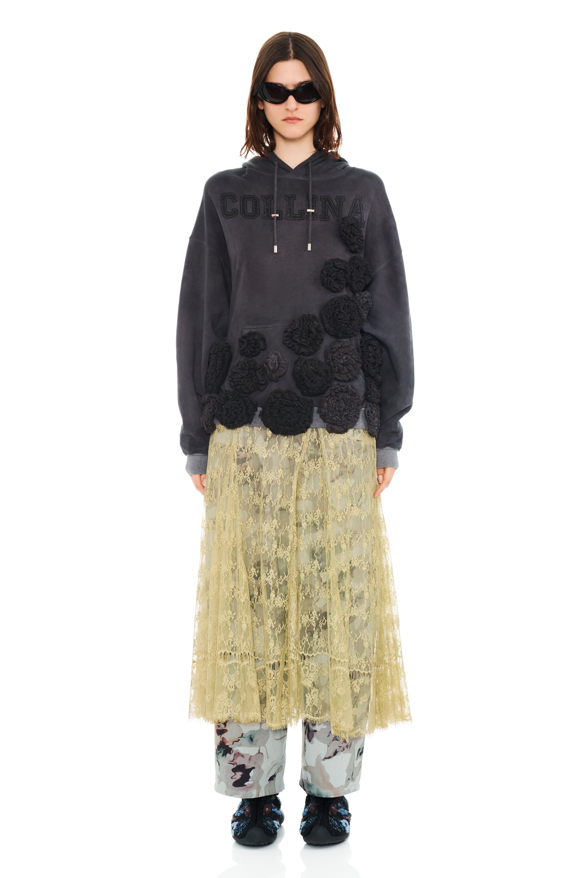 Oversized hoodie with textured flowers on the waist and COLLINA graphic at center. 100% deadstock cotton Model wears X Large and is 5'9'' Made in Portugal, finished in New York This is a hand dyed garment, there may be slight variations. Oversize fit: - XS=0-2, S=2-4, M=4-6, L=6-8, XL=10-12.