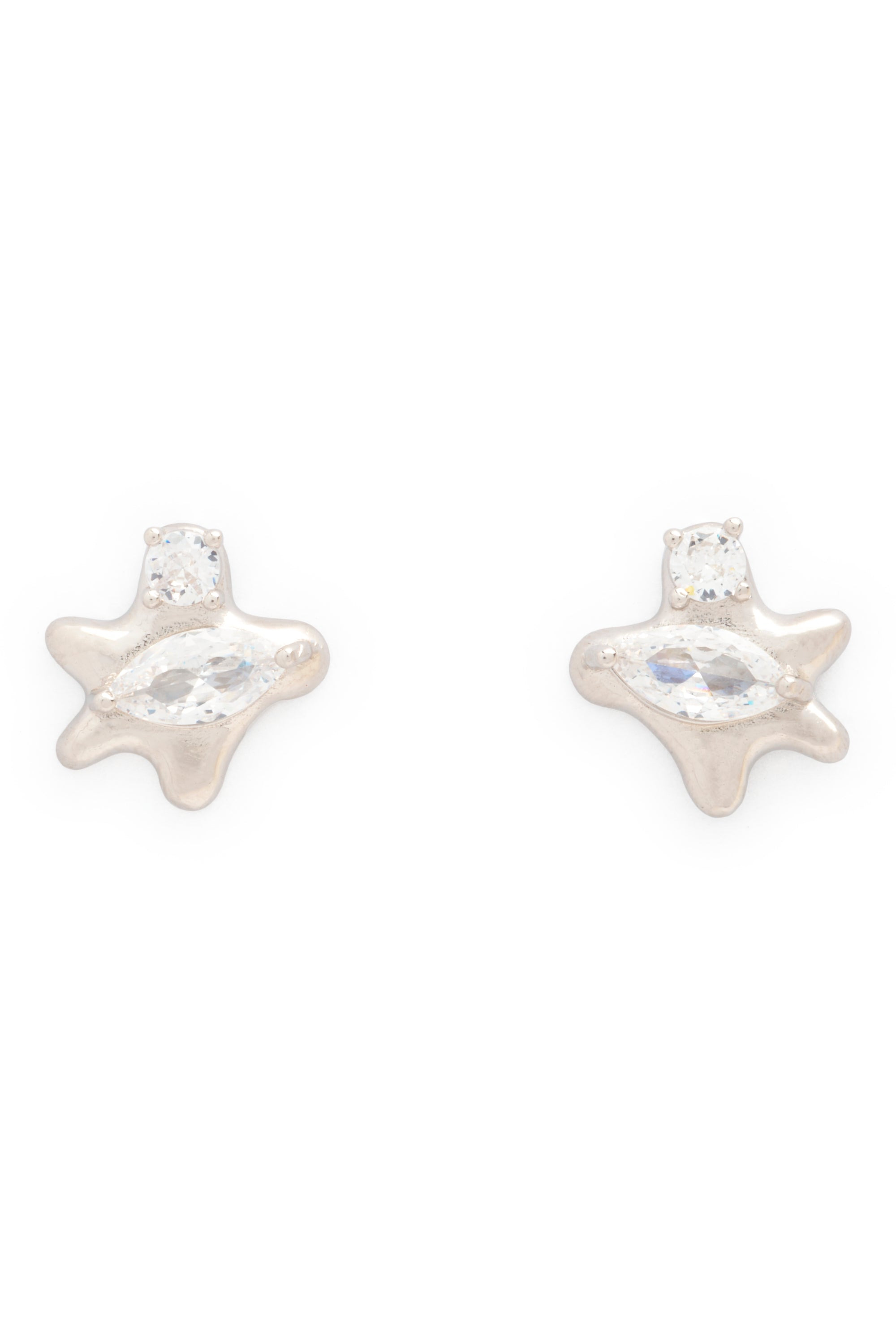 Sterling silver star shaped earrings. Maxi and mini clear gemstones. Stud back. 100% Sterling Silver and Cubic Zirconia 15 mm x 15 mm Jewelry bag handmade with fabric scraps from our NY studio. Each jewelry bag is one of a kind. This is a costume jewelry piece. Please use care with this item and do not wear while bathing or swimming.