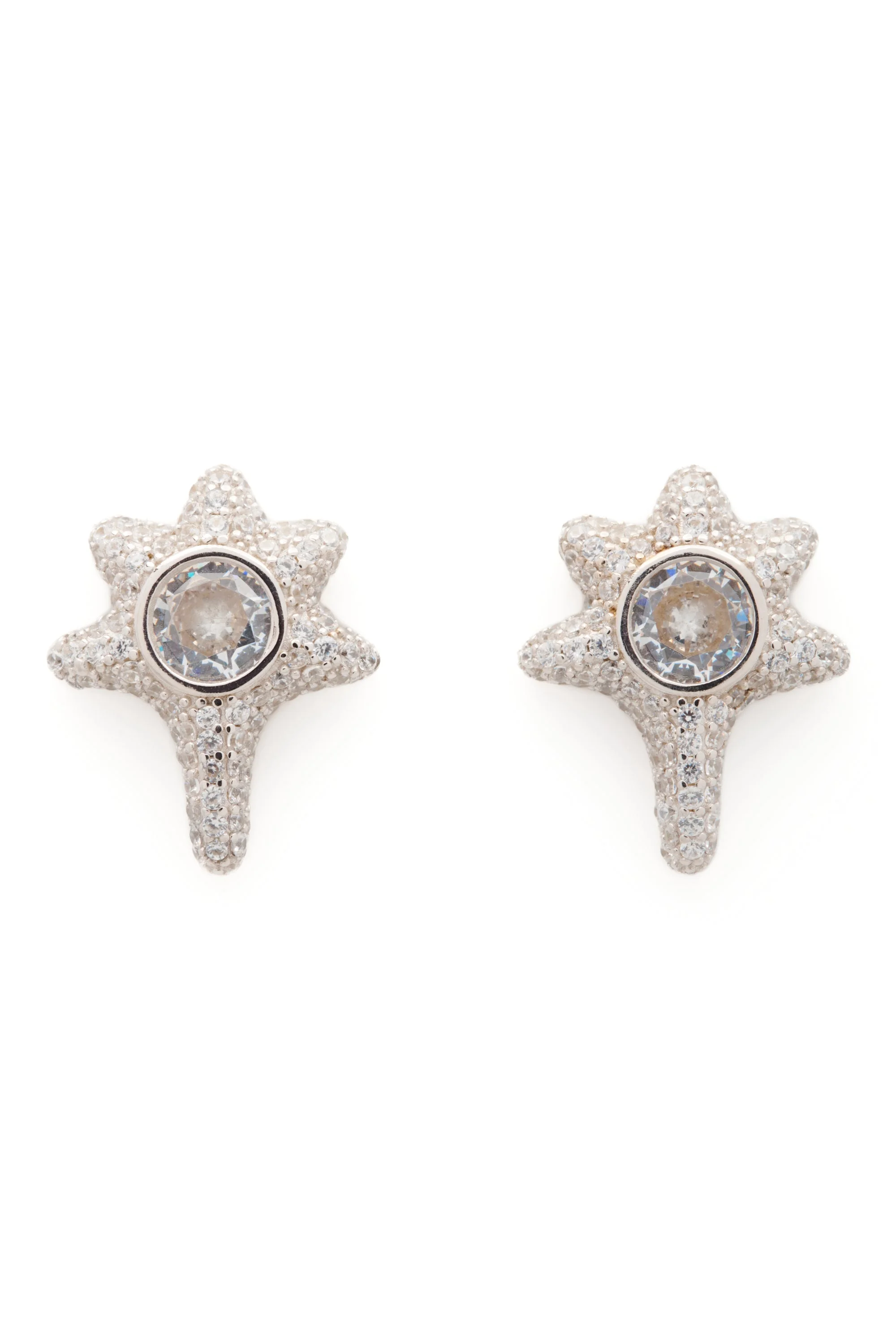 Crystal clear earrings with rhinestones in the shape of a star with a large crystal at the center. Stud back.100% sterling silver and cubic zirconia 1.5 x 3.5 cm Jewelry bag handmade with fabric scraps from our NY studio. Each jewelry bag is one of a kind. This is a costume jewelry piece. Please use care with this item and do not wear while bathing or swimming.
