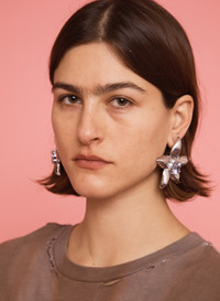 Oversized Starlink earrings with extra large rhinestone center.Stud back. Jewelry bag handmade with fabric scraps from our NY studio. Each jewelry bag is one of a kind. This is a costume jewelry piece. Please use care with this item and do not wear while bathing or swimming.