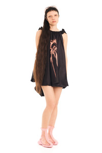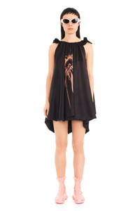 Sleveless, voluminous, satin bubble dress with earth faded flower graphic on front. Two-way zipper, hidden side pockets. Model wears size Small Made in New York