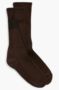 Earth Starburst socks with hand painted design. 98% organic cotton 1% nylon 1% spandex One size fits most Made in USA Each item is hand dyed, there may be slight variation.