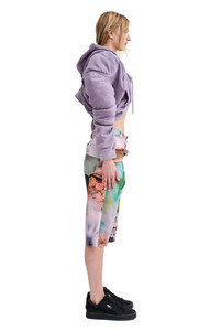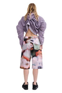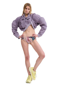 Oversized muscle cropped hoodie with exaggerated, puffy sleeves. Body is draped and tacked for a scrunched, gathered look. Muscle pads are removable. 100% Deadstock Cotton Fleece Made in Portugal, hand painted in New York This is a hand dyed garment, there may be slight variations Model wears size M